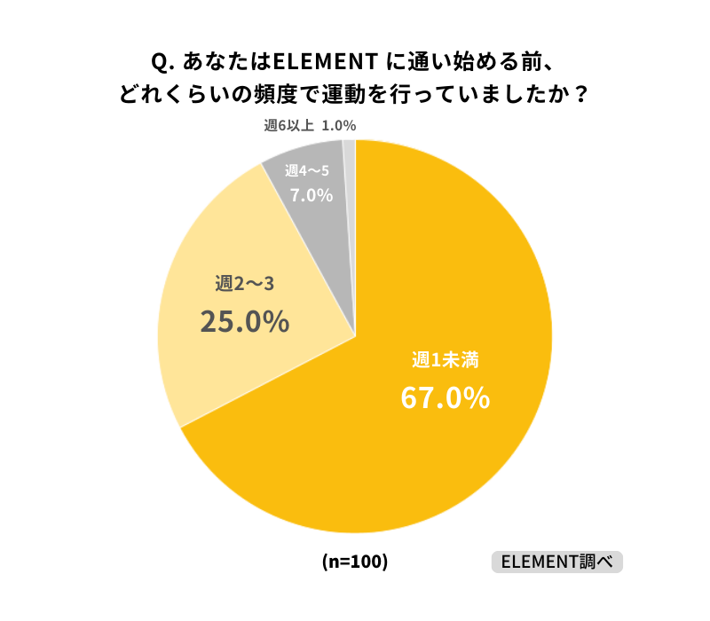 ①67%の方が、ELEMENT入会前の運動頻度は「週1未満」