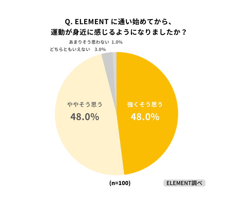 「ELEMENTに通い始めてから、運動が身近に感じるようになった」と聞いたところ、96%の方が「そう思う」と回答をしました。ELEMENTに通う前は、全体で67%の方が「週1未満」の運動頻度と回答していましたが、ELEMENTでの運動習慣の形成を通じて、多くの方が運動を身近に感じるようになりました。