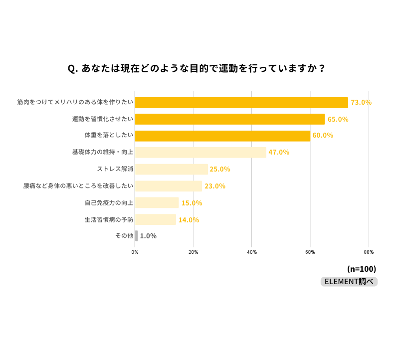 まずはじめに「ELEMENT入会前の運動頻度」について聞いたところ、全体で67%の方が「週1未満」と回答する結果になりました。約7割もの方が入会前は、運動の習慣がなく、運動初心者の方が多いということが明らかになりました。