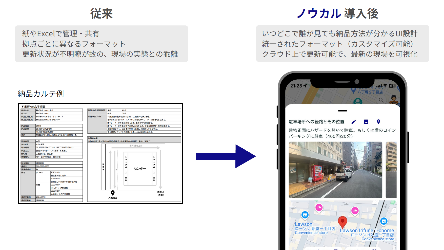 「ノウカル」は、集荷・配送先の施設・顧客などの現場情報を共有できる法人専用スマホアプリです。現場での荷物受け渡しまでに必要な情報、いわゆる「納品カルテ」をクラウドで一元管理し、ドライバー同士が簡単に情報を共有できる仕組みを提供します。新人ドライバーはアプリで画像や動画つきの納品手順を確認できるため、研修や電話対応といった工数を80%削減。さらに、納品カルテのデータ管理や資料の印刷費も大幅にカットできます。