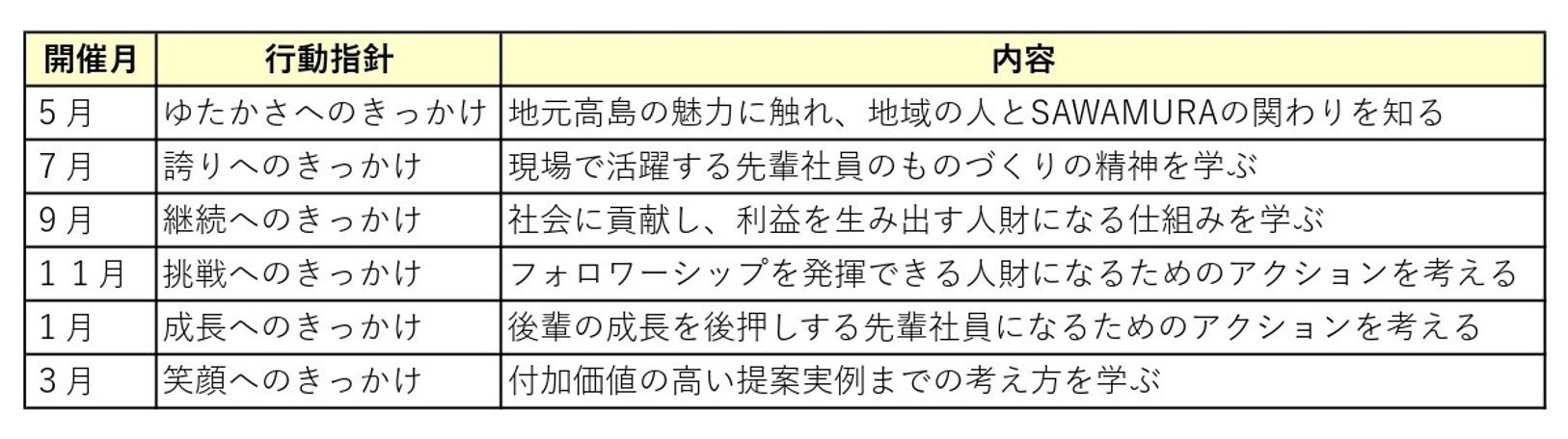 関わる人すべてのミライをひらくきっかけを創造する総合建設会社SAWAMURA(本社:滋賀県高島市)は、新入社員研修の一環として、自社のミッションの理解・自分事化を促し、これからのリーダーを育成する研修「きっかけ創造ゼミ」を行なっています。今回が2回目の開催となり、1年間で全6回を予定しています。