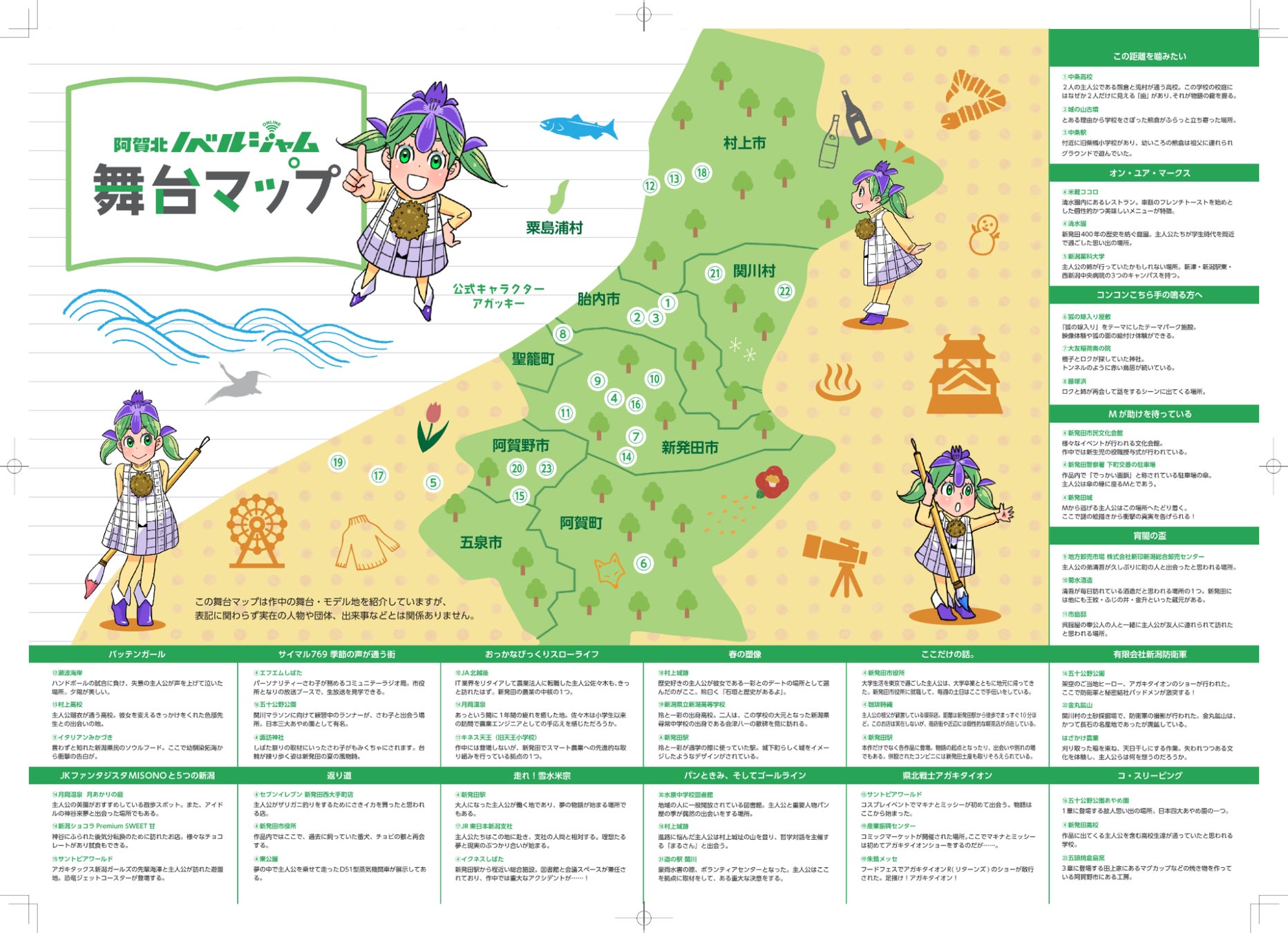 阿賀北ノベルジャム第1回〜第3回の作品内に登場する数々の舞台を紹介する舞台マップが完成!これを見れば阿賀北ノベルジャム作品と阿賀北地域の名所を一目で知ることができます。 授賞式に先立ちお披露目の予定です。