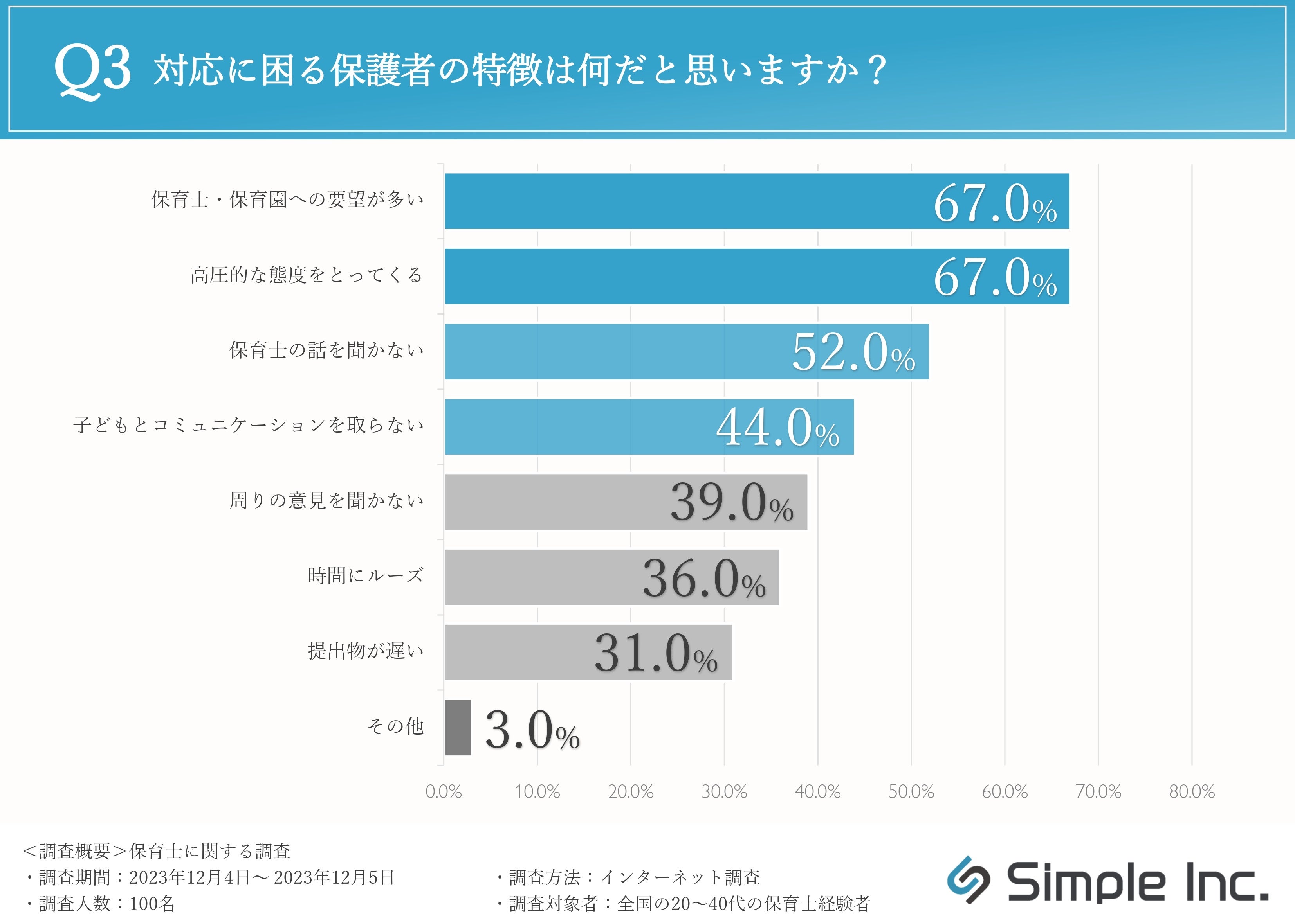 対応に困る保護者の特徴について伺ったところ、「高圧的な態度をとってくる(67.0%)」「保育士・保育園への要望が多い(67.0%)」「保育士の話を聞かない(52.0%)」という回答が上位に挙がりました。