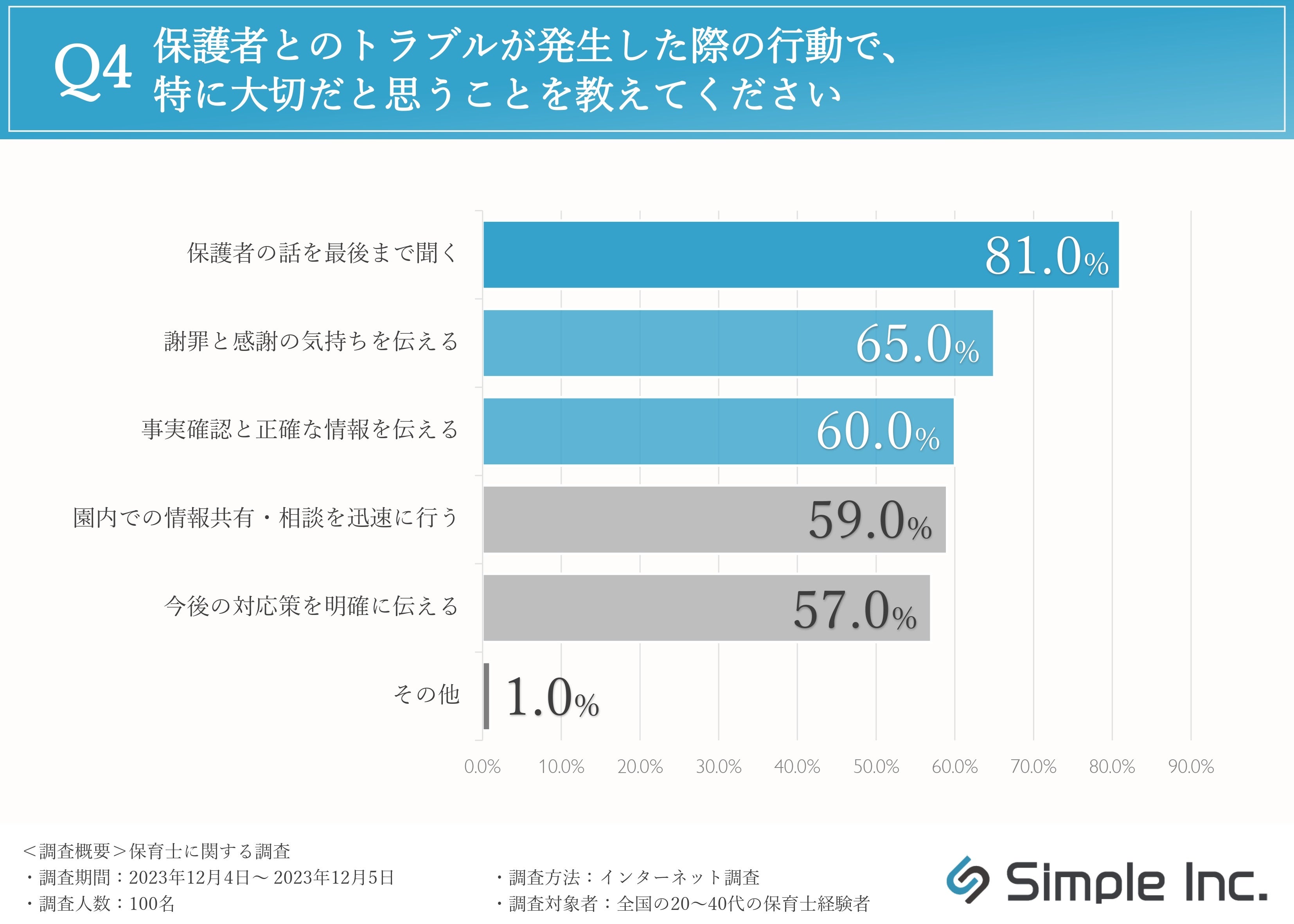 保護者とのトラブルが発生した際の行動で、特に大切だと思うことについて伺ったところ、「保護者の話を最後まで聞く(81.0%)」「謝罪と感謝の気持ちを伝える(65.0%)」「事実確認と正確な情報を伝える(60.0%)」という回答が集まりました。