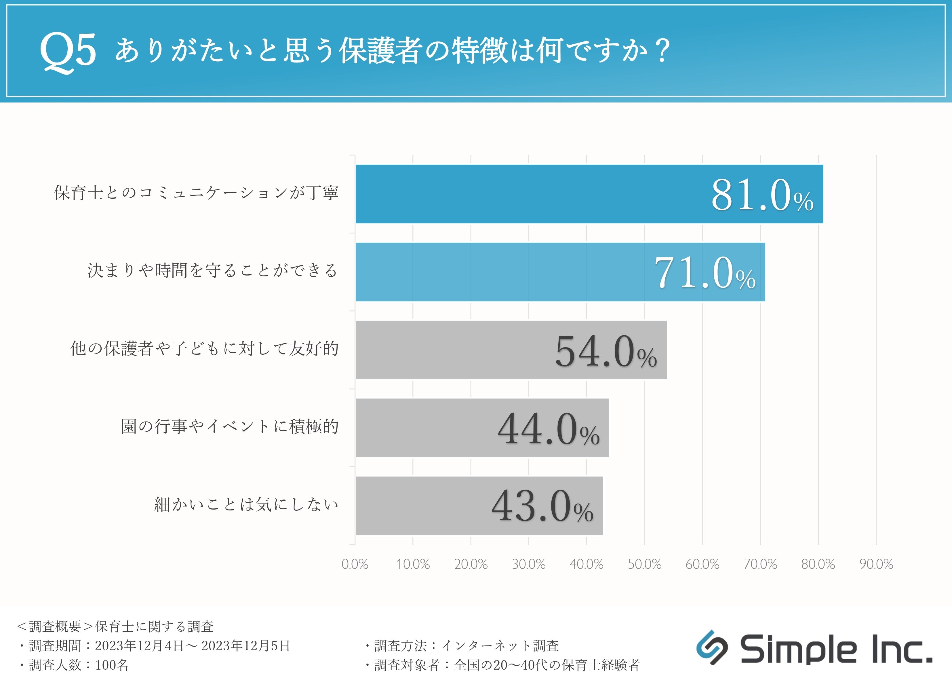 ここまで、トラブルに関する内容を中心に聞いてきましたが、逆にありがたいと思う保護者の特徴について伺ったところ、「保育士とのコミュニケーションが丁寧(81.0%)」「決まりや時間を守ることができる(71.0%)」「他の保護者や子どもに対して友好的(54.0%)」という回答が集まりました。