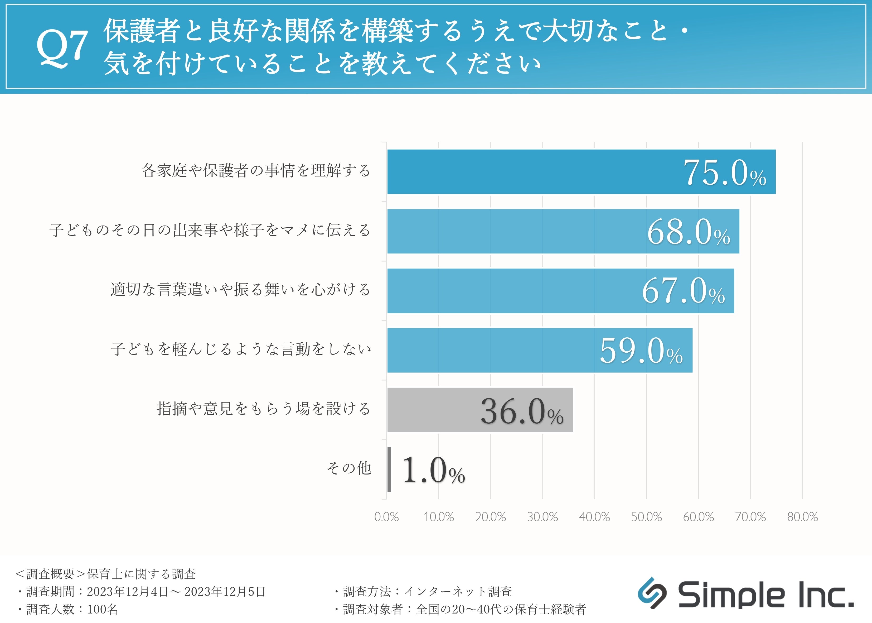 最後に、保護者と良好な関係を構築するうえで大切なこと・気を付けていることについて伺ったところ、「各家庭や保護者の事情を理解する(75.0%)」「子どものその日の出来事や様子をマメに伝える(68.0%)」「適切な言葉遣いや振る舞いを心がける(67.0%)」という回答が集まりました。