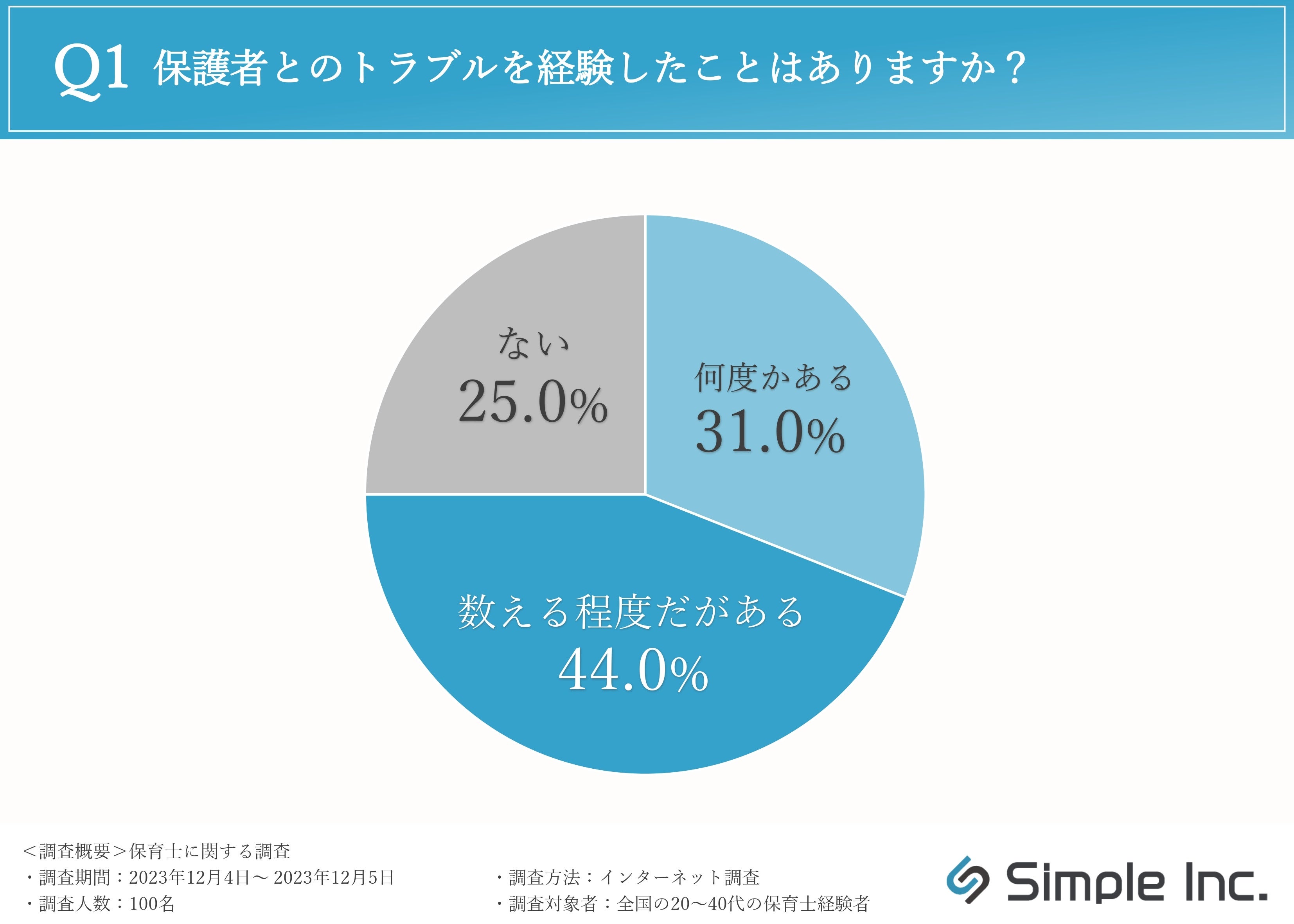 はじめに、保護者とのトラブルを経験したことがあるか伺ったところ、「数える程度だがある(44.0%)」「何度かある(31.0%)」という回答が集まり、実に7割以上の方はトラブル経験があることがわかりました。