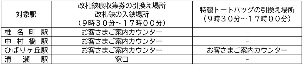 ②椎名町駅・中村橋駅・ひばりヶ丘駅・清瀬駅のいずれかの駅で、EMot購入画面を係員に呈示し、改札鋏痕収集券に引換え(特製トートバッグはひばりヶ丘駅でのみ引換え)