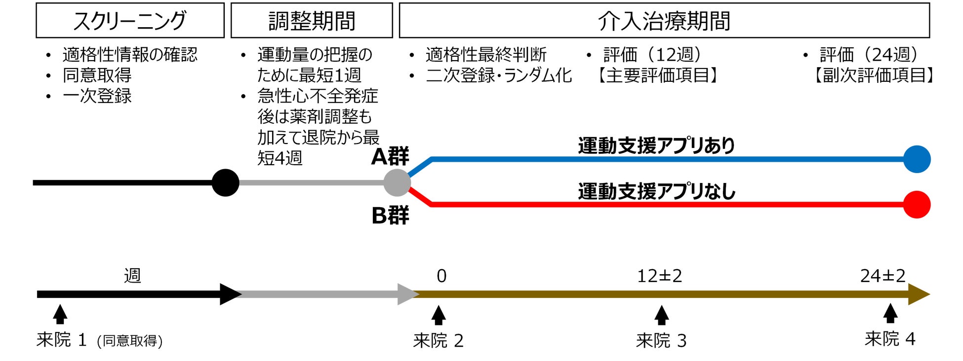 18歳以上の心不全患者さんを対象としています。「運動支援アプリ」を使用するグループ(A群)と使用しないグループ(B群)の2つのグループに心不全患者さんを分け、24週間の経過観察を行い、比較を行いました(図2)。