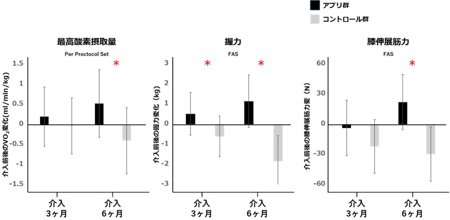 治験期間中の不具合としては、介入群の38名(77.6%)で、プログラムエラーのため、治験参加中に短時間(約24時間)、アプリからの通知が届きませんでした。重篤な有害事象としては、心不全増悪、心筋梗塞、不安定狭心症などの心血管イベントが、両群で発症しましたが、その頻度は同程度でした(介入群3名、非介入群2名)。主要評価項目である12週後の最高酸素摂取量は、運動支援プログラムの介入で改善しませんでした(mean difference=0.232, 95%CI=-0.557-1.021, p=0.561)。また、副次評価項目である生活の質アンケートのKCCQ Overall Summary Score、心血管イベントの発症については、有意差を認めませんでした。一方で、24週後には、両手の握力(図3、右:mean difference=3.42, 95%CI=2.07-4.77, p < 0.001, 左:mean difference=2.99, 95%CI=1.65-4.33, p < 0.001)、両側の膝伸展筋力(注9)(図3、右:mean difference=63.54, 95%CI=32.44-94.65, p < 0.001, 左:mean difference=51.67, 95%CI=22.80-80.53, p < 0.001)の有意な改善を認めました。さらに、アプリを継続的に使用している被験者に限定したPer Protocol Set解析では、副次評価項目の24週後の最高酸素摂取量が有意に改善しました(図3、mean difference=0.931, 95%CI=0.023-1.839, p=0.045)。