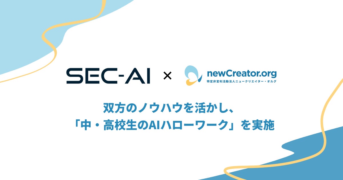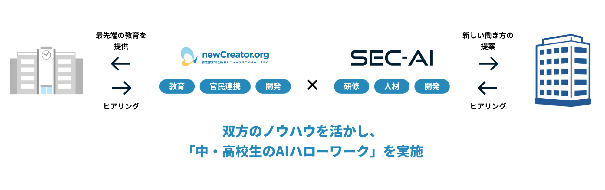特定非営利活動法人ニュークリエイター・オルグ(以下、ニュークリエイター・オルグ)と『デジタルトレーニングセンター SEC-AI(セカイ)』を運営するDXHR株式会社(以下、DXHR)は、中・高校生に対する未来のキャリア形成支援の一環として、新たな教育プログラム『中・高校生のAIハローワーク』の提供を開始します。