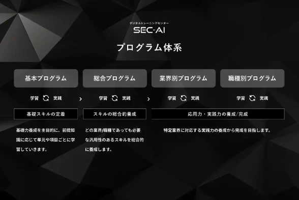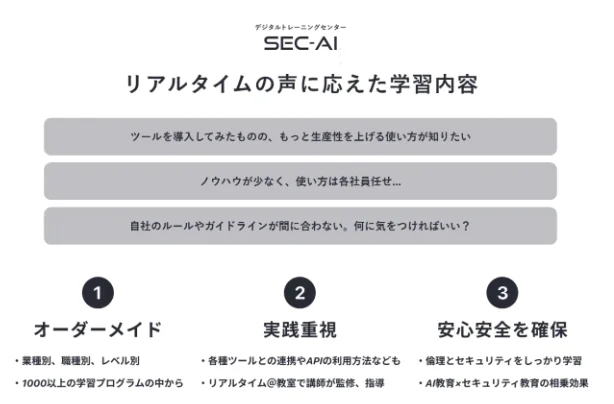 DXHR株式会社の展開する『デジタルトレーニングセンター SEC-AI(セカイ)』は、変化の激しい生成AIの分野において必要な知識と実践を体系的に取り入れ、「できるようになったその日から業務で使ってもらう」「楽しんでもらう」「AIと友達になって帰ってもらう」ことを目指し、実際のビジネス・業務に確実に生かすことができる人材を育成します。1,000以上のプログラムの中から各受講者の業種・職種・レベルや各企業の課題・状況に合わせ最適なカリキュラムを作成することを可能とし、学習と実践を繰り返しつつ、育成状況をモニタリング・フィードバックしていくことで、生産性向上に繋がる応用力を身につけていくことができます。