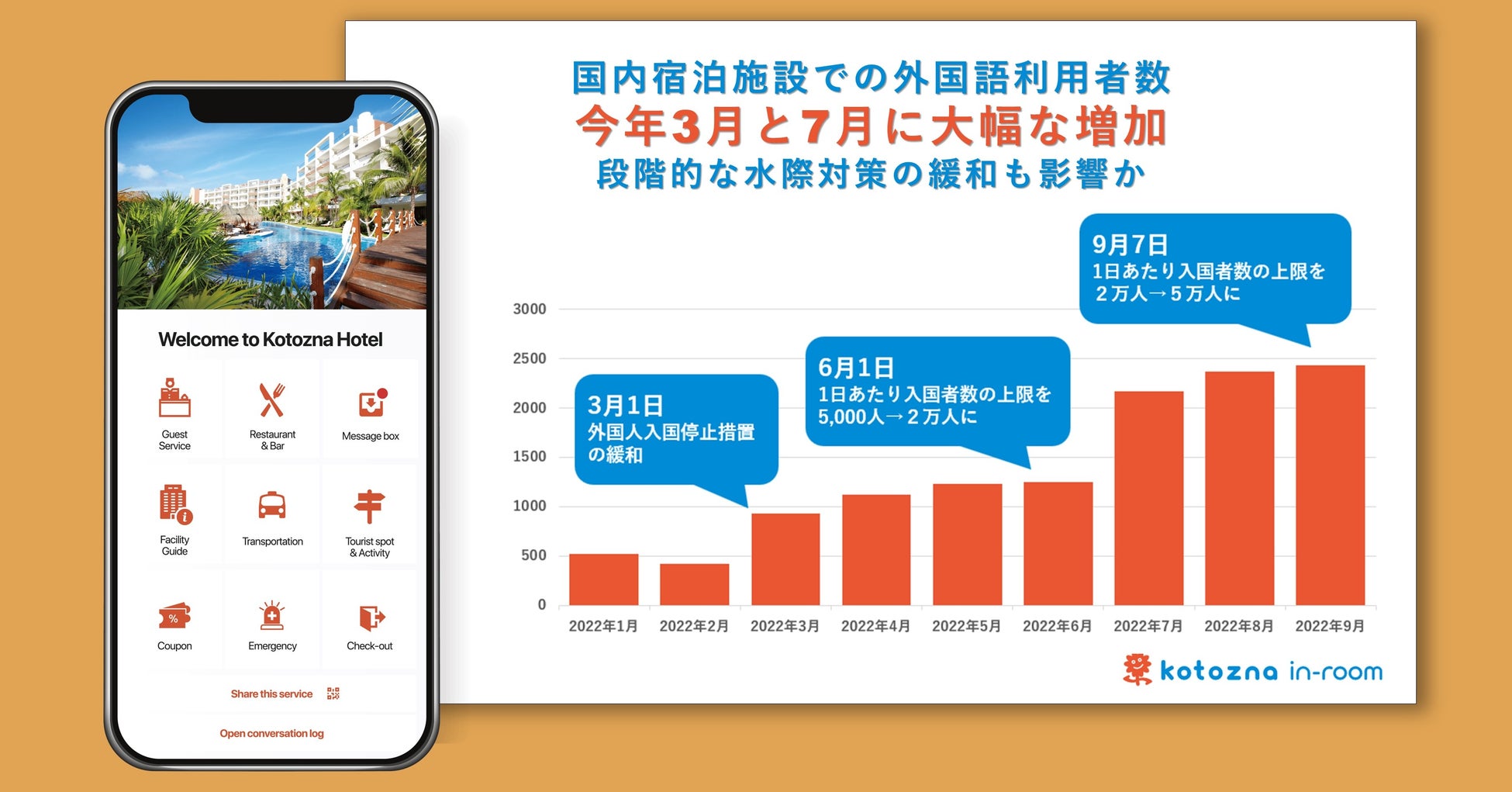 Kotozna株式会社(本社:東京都港区、代表取締役 後藤玄利、https://kotozna.com/ )は、当社が提供する宿泊施設向け多言語コミュニケーションツール「Kotozna In-room」利用データより、国内宿泊施設での外国語利用状況を調査しました。その結果、外国語利用者は、今年3月と7月に大幅な増加が見受けられました。今年段階的に行われている水際対策の緩和も影響していると見られます。9月に関しては微増となり、1日あたり入国者数の上限数が9月7日より2万人から5万人に引き上げられた緩和策については、影響が限定的となりました。10月11日より実施される水際対策の緩和に際して、「Kotozna In-room」導入の宿泊施設であるスターゲイトホテル関西エアポートでは「インバウンド回復の大きな一歩である」といった期待の声も挙がりました。