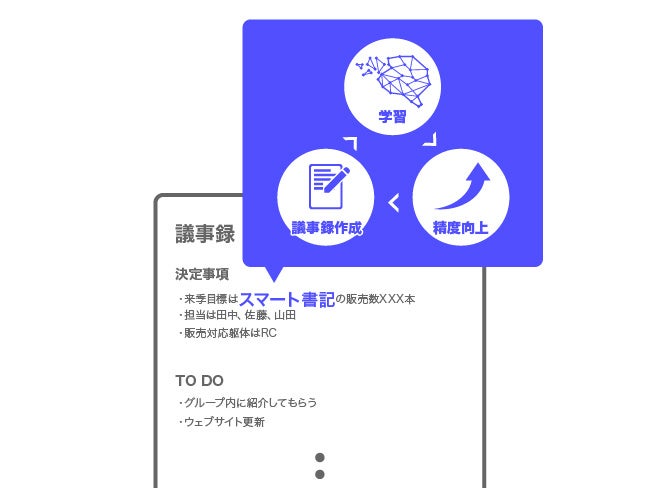 今回の新機能により、事業や組織運営を円滑に進めるために欠かせない商談や会議の場で、キーパーソンの発言や重要な発言にすぐにアクセス・フォーカスできます。また、業界・業種・企業特有のキーワードをスマート書記が学習し、使えば使うほど個社にあわせた議事録の作成を実現します。