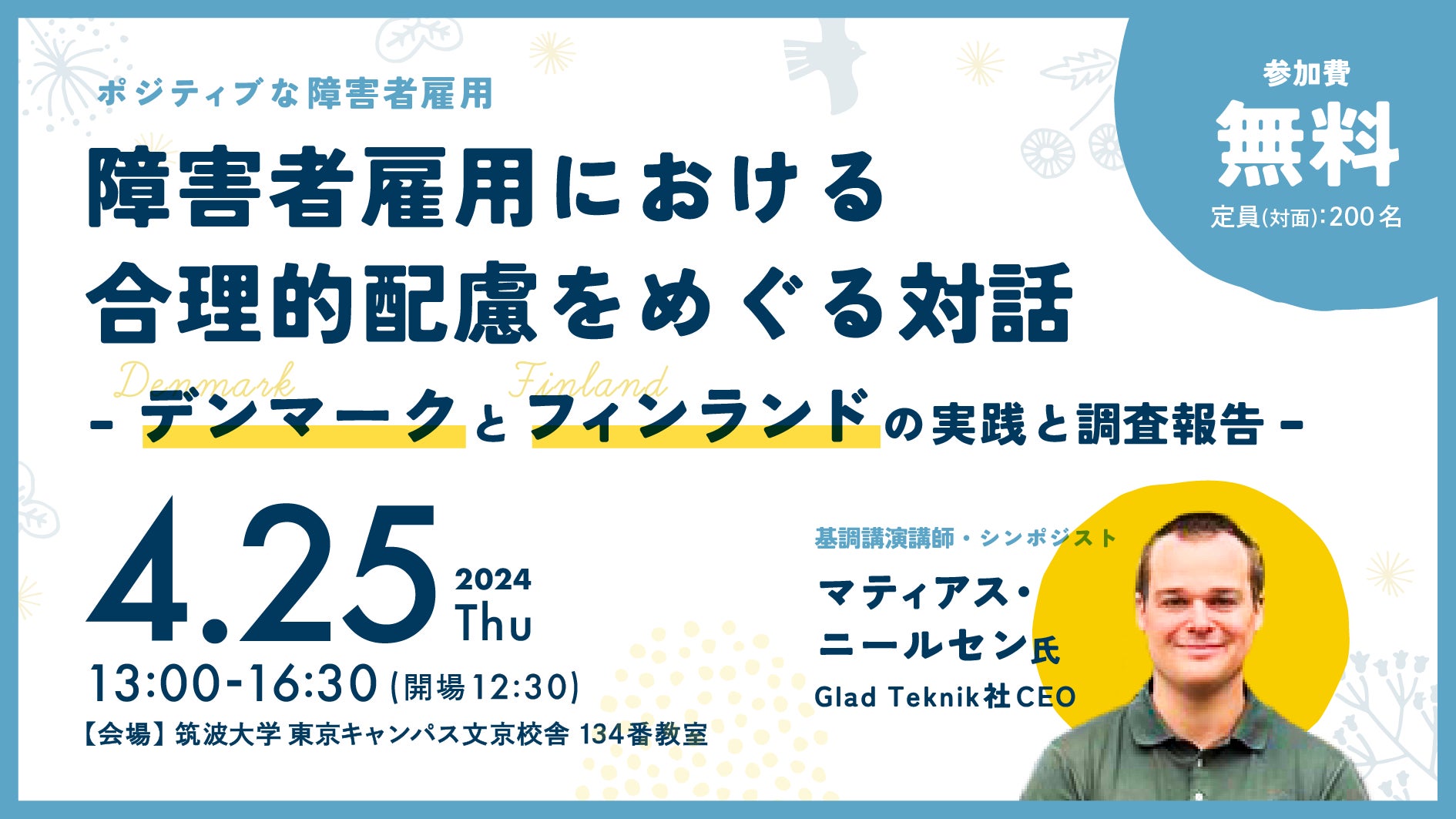 本イベントはその報告会です。さらに、デンマークで本人の強みを発揮できるように環境調整を行い、多くの発達障害者の雇用を成功させているGlad Teknik社のマティアス氏のお話をうかがいます。マティアス氏は本人も発達障害当事者であり、自身の経験を踏まえて、経営者として、障害のある従業員との対話と環境調整を強みとした職場環境を提供しています。現在に至るまでの経験や発達障害者との起業の話を聞きながら、対話や合理的配慮について考える機会をもちます。また、シンポジウムでは、今後の障害者雇用の向かうべきところについて、「合理的配慮をめぐる対話」「強みの発揮と環境調整」等といった視点から、参加者のみなさんとディスカッションを行い、障害者雇用の質について考える機会にしたいと思います。