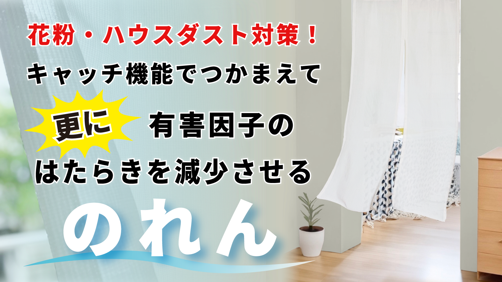 花粉・ハウスダストに含まれる有害因子のはたらきを減少させる効果をもつ、機能付きのれん。玄関など空気の通り道にかけるだけでいいので、特にこれからの時期に花粉対策を取り入れたい方にぴったり!