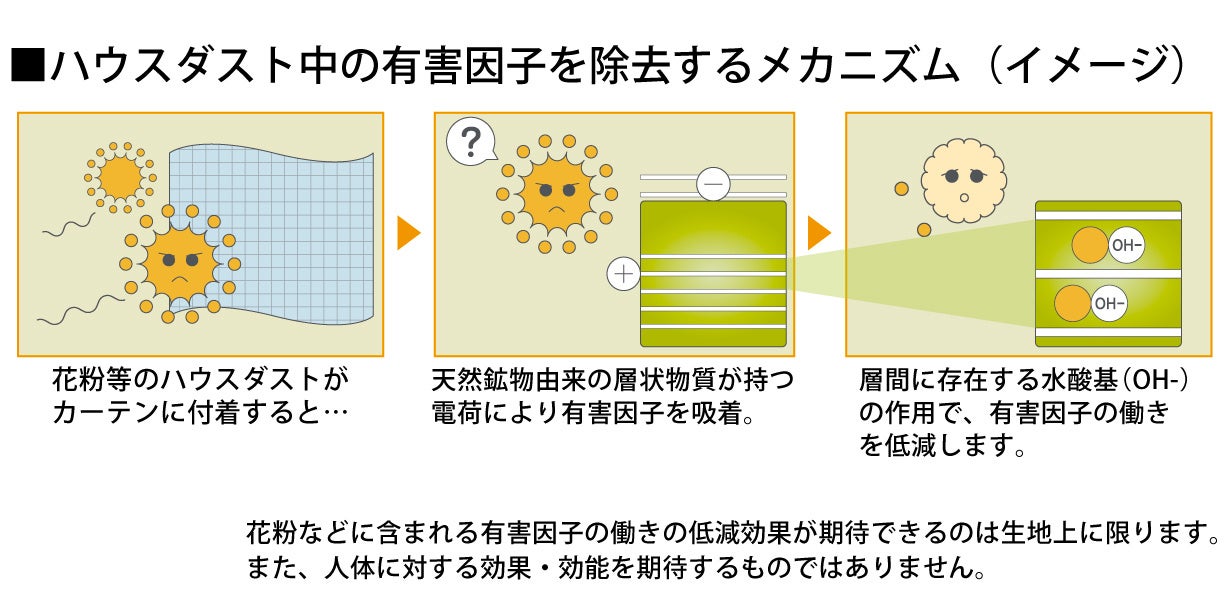 生地に付着した花粉やハウスダストに含まれる有害因子を、特殊な繊維がもつ電荷(電気)により生地に吸着し、生地に含まれる原子の作用で、付着した有害因子のはたらきを減少させます。