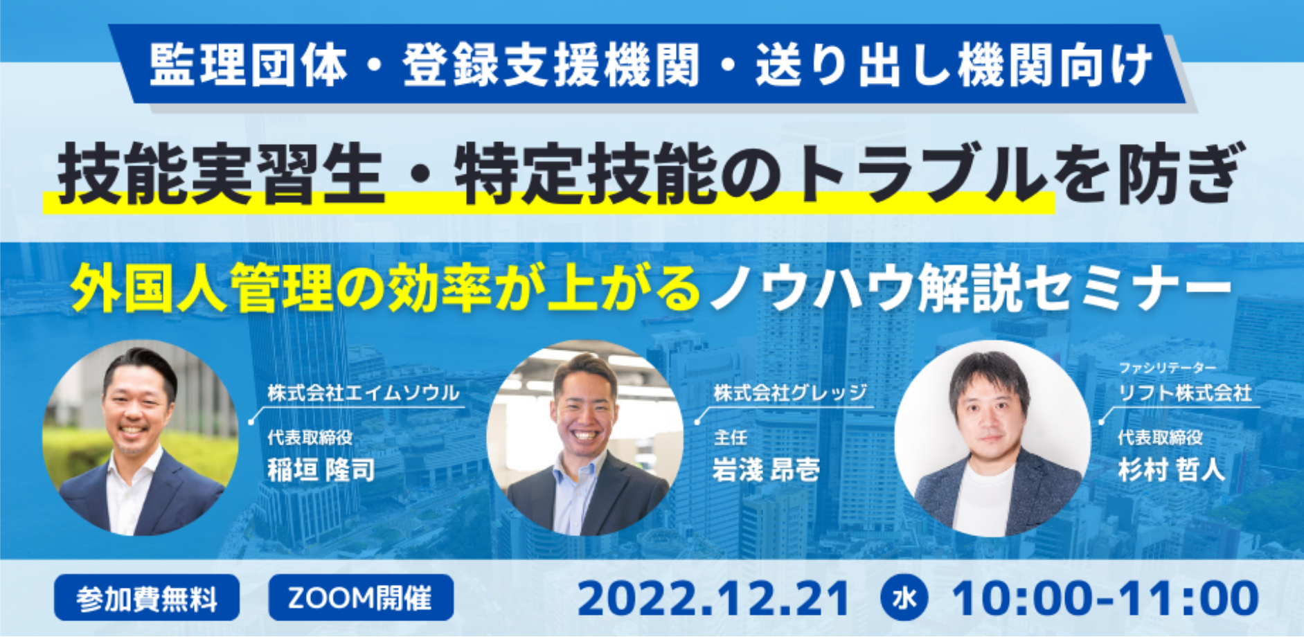 外国人材管理ツール「dekisugi」を運営する、株式会社グレッジ(本社:大阪府西区、代表取締役:阪本裕哉)は、2022年12日21(金)に、リフト株式会社、株式会社エイムソウルとオンライン共催セミナーを開催いたします。