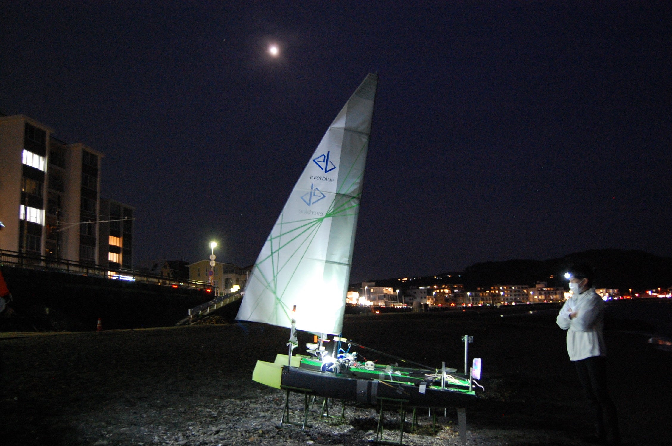 長時間に及ぶ沿岸部の海洋調査において昼間は他船舶や舟艇の往来が多く、自由に移動することが難しいです。一方夜間であれば他船はほとんどないため、安全に長時間調査活動を行うことができます。帆船型ドローンは大きな帆を持ち、ライトアップすることで被視認性が高く、航行速度も低速なので他船からの発見回避も容易です。