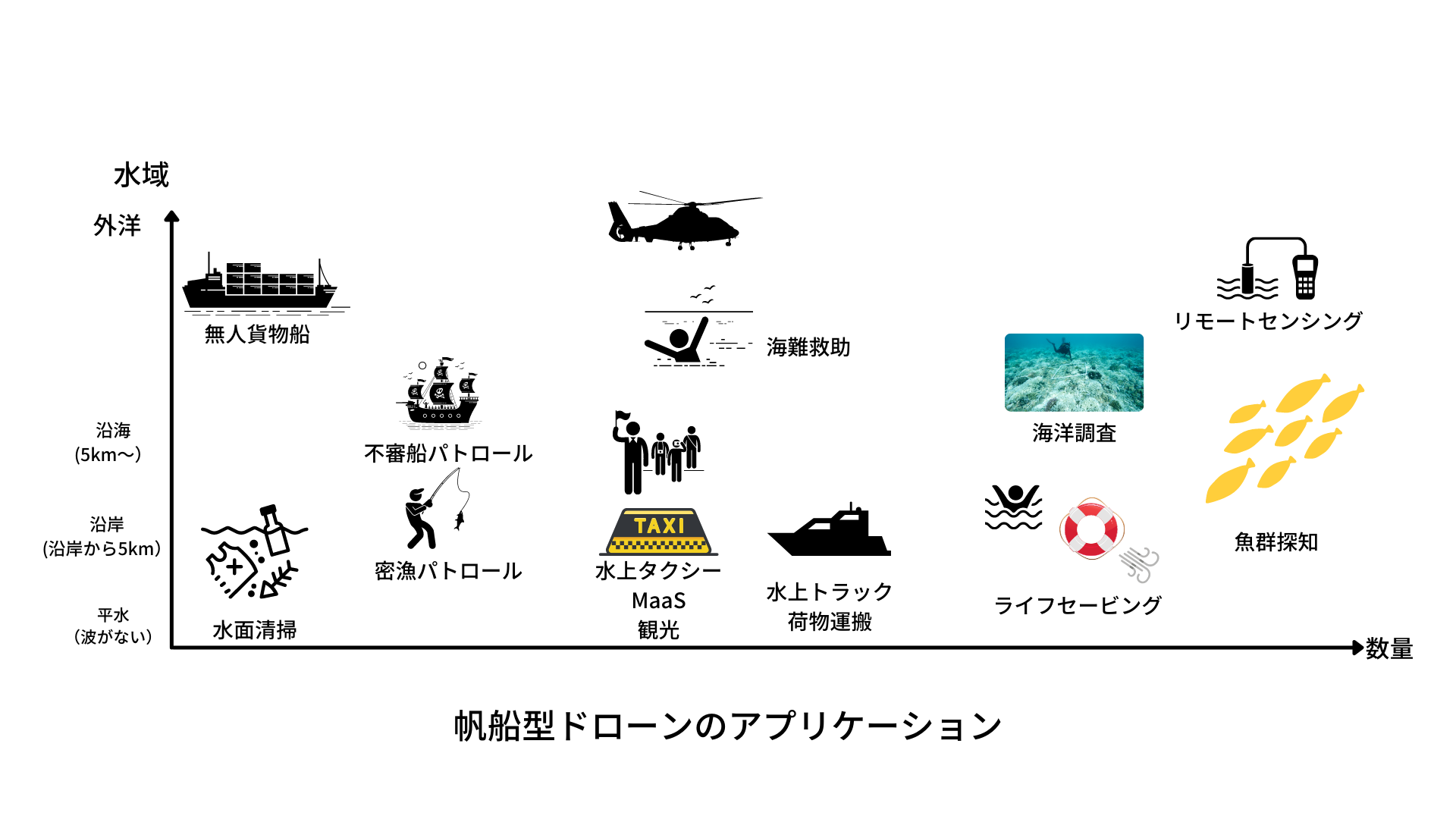 帆船型ドローンは、遭難者の捜索や長時間に渡る海洋調査でも役立ちます。沖に流されてしまった要救助者の捜索を夜間、広範囲かつ長時間できるのは、風力をダイレクトに推進力にかえる帆船ならではのメリットで、現状で連続8時間、今後大容量バッテリーや太陽光発電の併用などで24時間以上の稼働時間を目指しています。