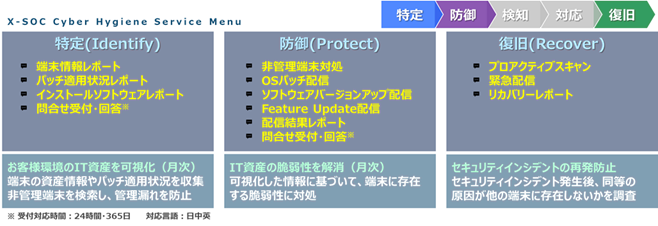 「X-SOC Cyber Hygiene Service」は、お客さまのすべての IT 資産を可視化し、パッチの適用状況の確認や端末の 管理を徹底して非管理端末を特定するとともに、発見した脆弱性に対して適切な防御・復旧対応を行うことで、IT 資産 全体を健全な状態に保ち、サイバー攻撃による脅威から保護します。