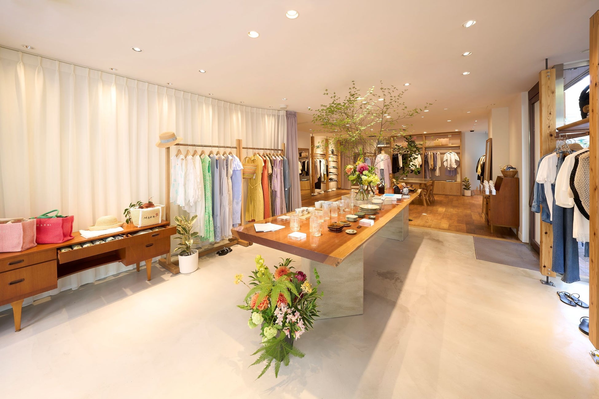 自由が丘店では、時代性に寄り添ったエッセンシャルなオリジナル商品と、デザイン性の高い国内外のセレクト商品を中心としたお洋服やアクセサリーの他、洗濯洗剤などのライフスタイル雑貨、器、写真集などのアート作品も取り扱い、地域の老舗フローリストに活けていただく四季折々の花が、華やかな空間を演出した心地よい空間で、自宅のクローゼットから今日着る服を選ぶようにお買い物を楽しんでいただけます。