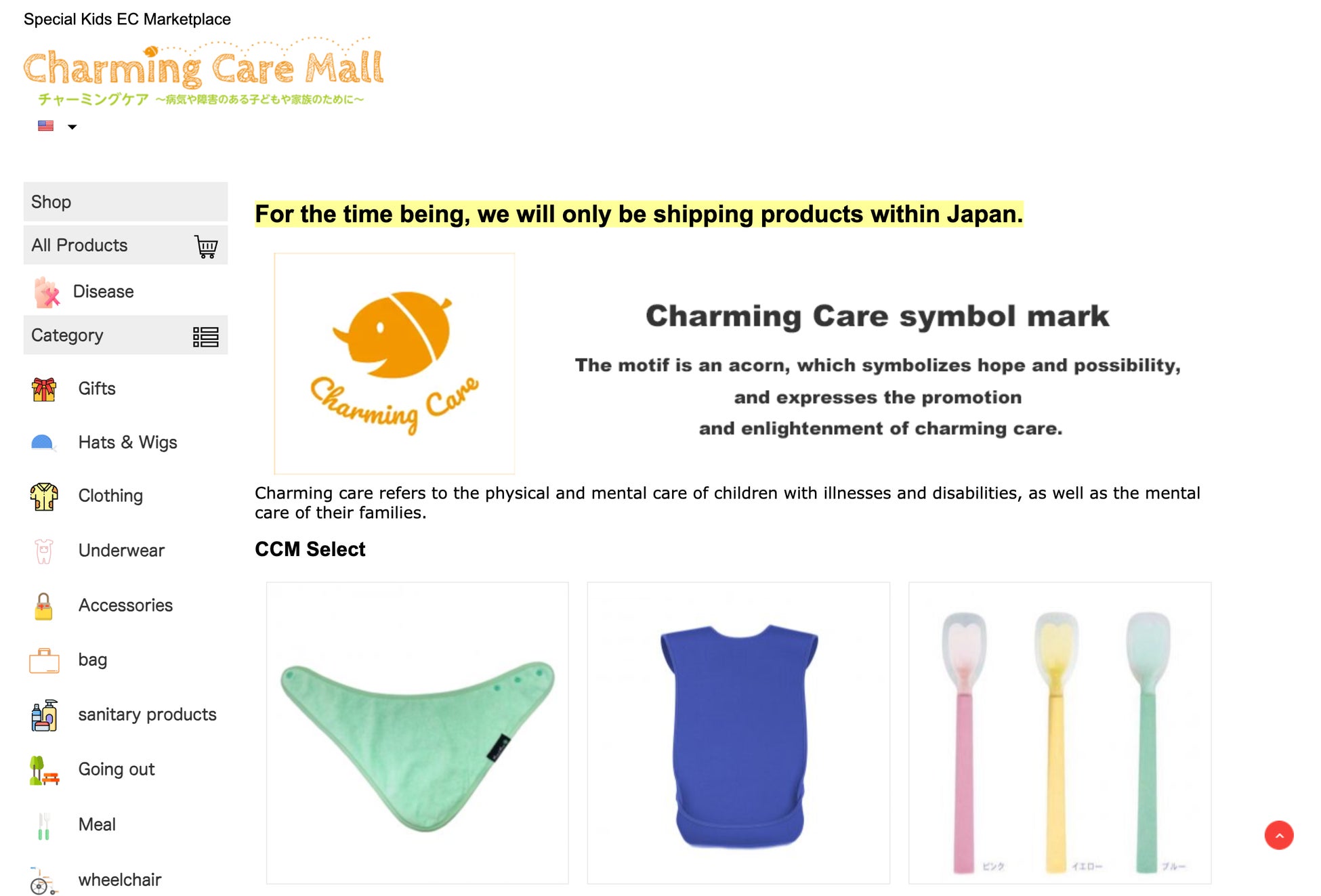 2020年1月、病気や障害があったとしても子どもの可愛らしさ・子どもらしさを尊重するケアという意味を込め〝チャーミングケア〟と名付け、ECマーケットプレイス「チャーミングケアモール」の立ち上げに至りました。