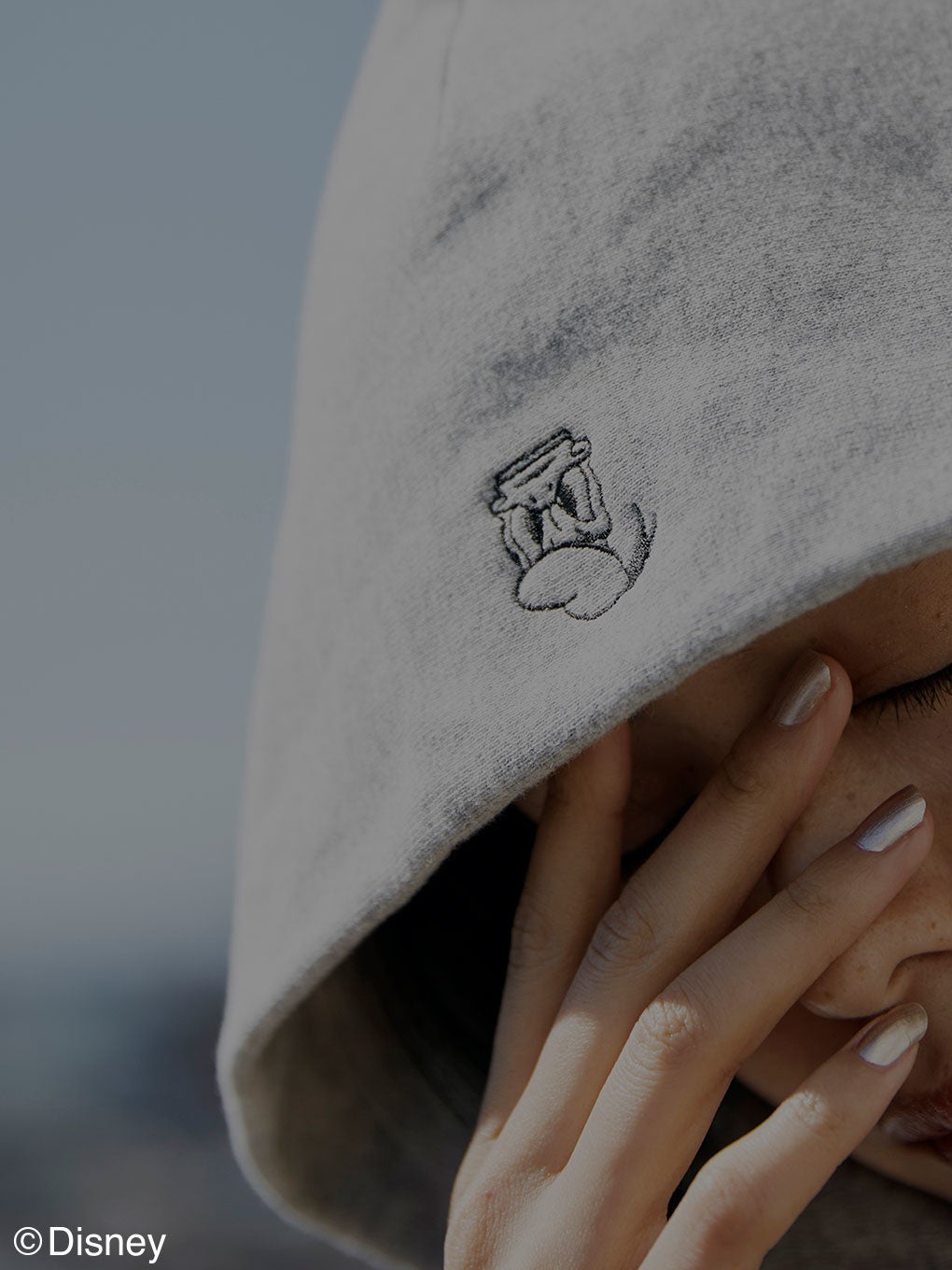 フードの後ろにドナルドダックの刺繍を施したスリーブレスフーディ。