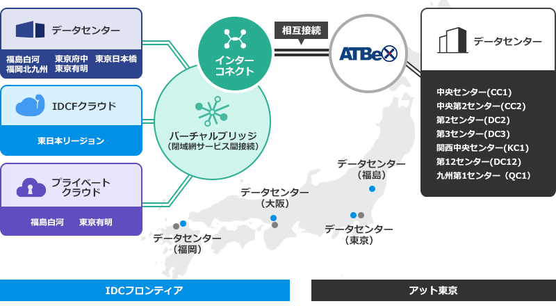 また、アット東京のお客さまは、「ATBeX ServiceLink for IDCF」を介して、IDCフロンティアのハウジングサービスや、国産クラウドサービスである「IDCFクラウド」「IDCF プライベートクラウド」など、IDCフロンティアのデータセンターで提供される各サービスが利用できる他、両社のデータセンターのラック間接続が可能となります。