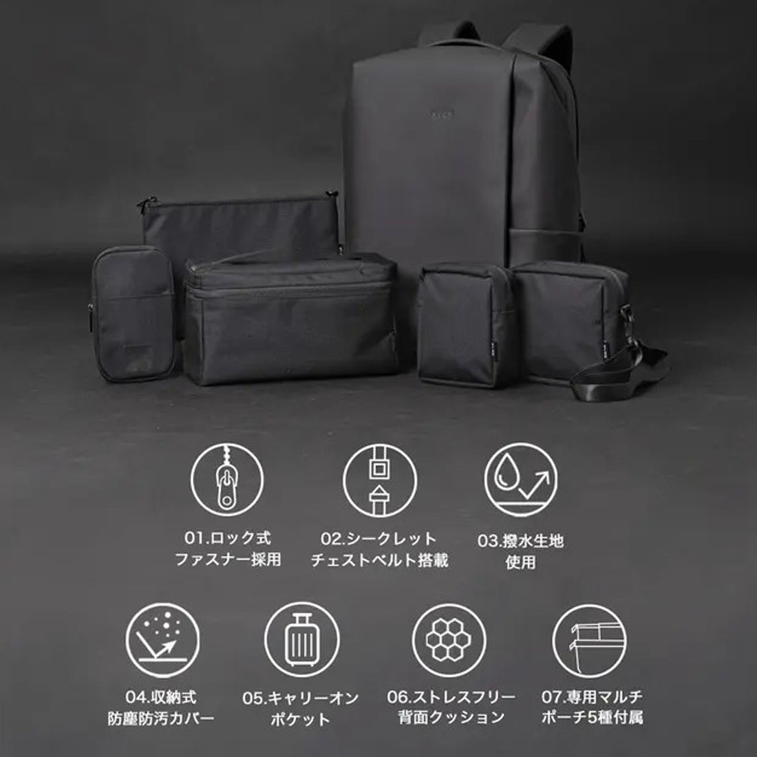 さらに、リュック本体に加え、さまざまな用途に応じた5種類のポーチがセットになっており、