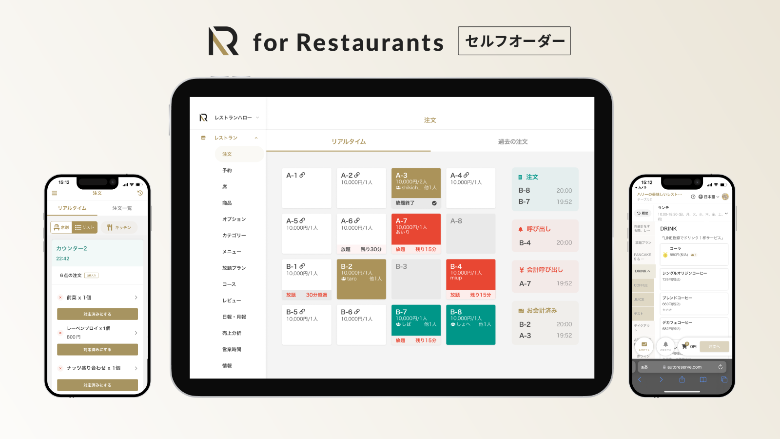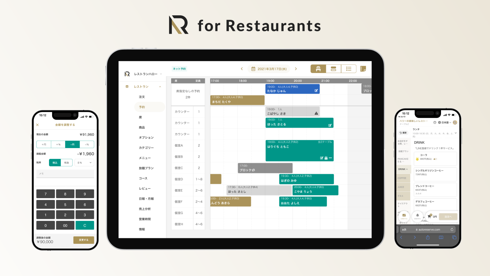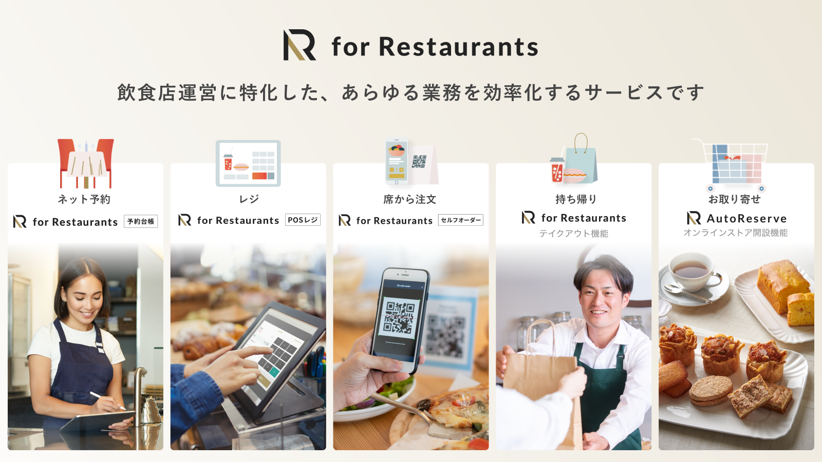 AutoReserve for Restaurantsは、飲食店の運営に必要な予約やオーダーなどの顧客情報の管理を行うことで業務を効率化するサービスです。予約台帳・POSレジ・セルフオーダーシステム・テイクアウト機能・オンラインストア開設機能など、飲食店の人手不足による課題へアプローチし、よりスムーズな運営をサポートします。