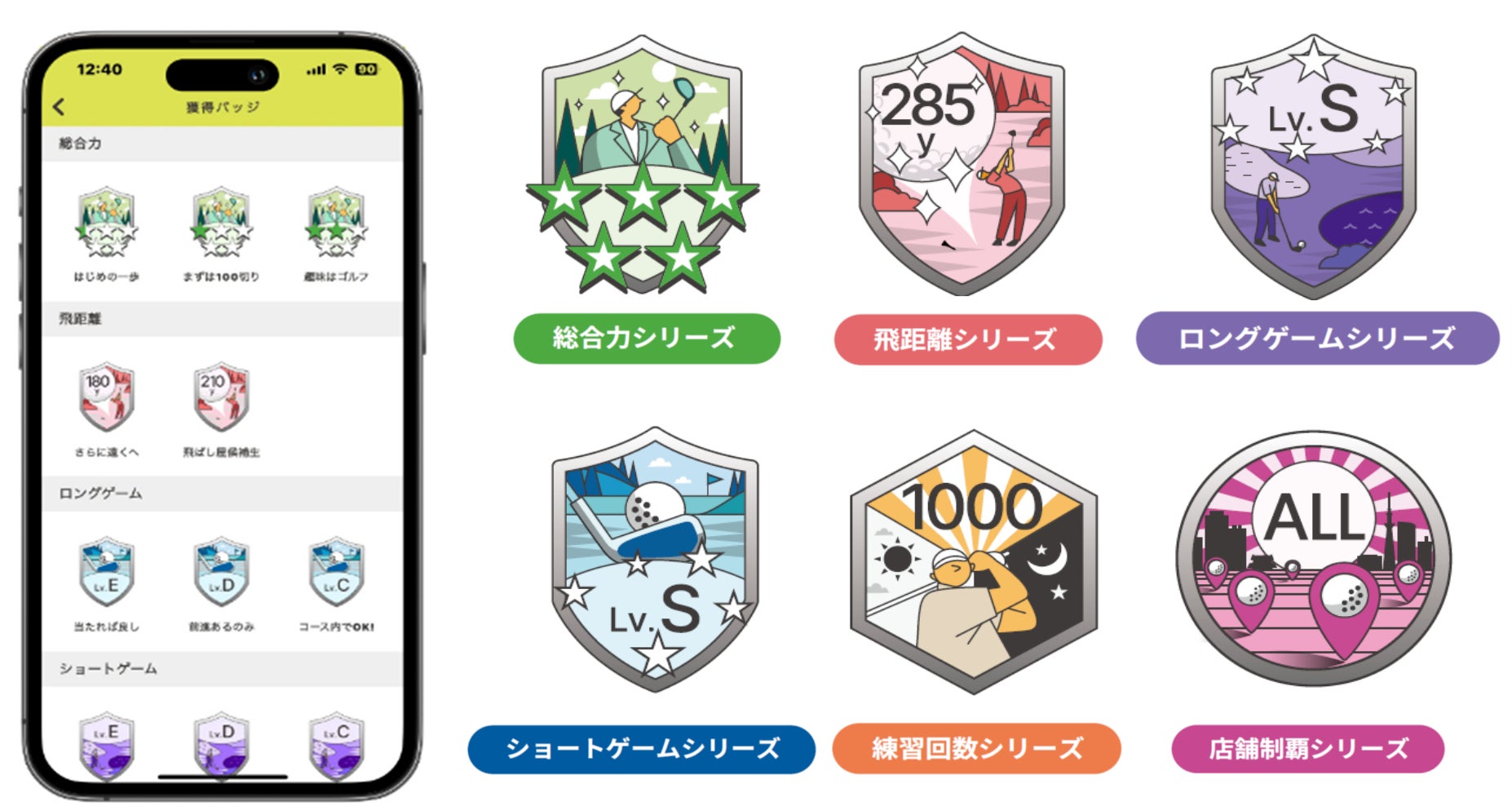 バッジには、総合力シリーズ、飛距離シリーズ、ロングゲームシリーズ、ショートゲームシリーズ、練習回数シリーズ、店舗制覇シリーズなどの各シリーズを展開中で、それぞれのシリーズ内での一定基準到達するとランクアップしバッジが獲得できます。バッジをコレクションするエンタメ性があり、会員の練習へのモチベーションを刺激します。