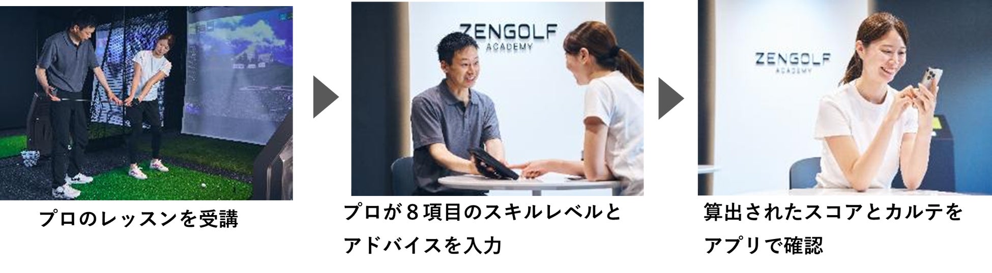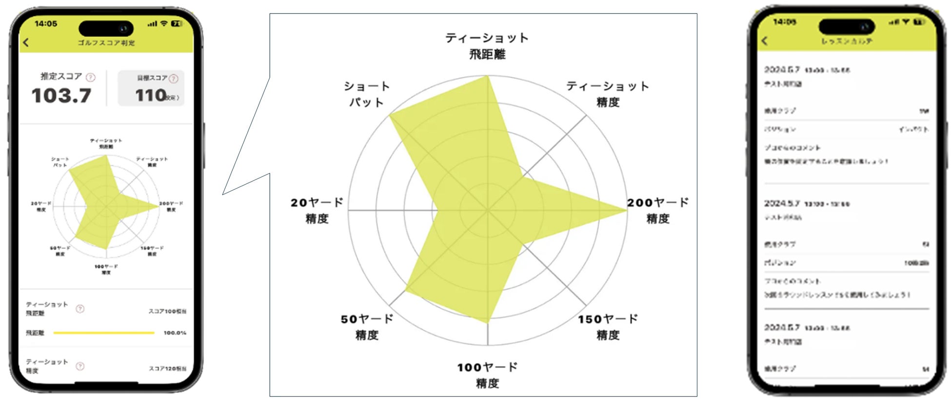 今回新たに搭載されたスコア判定機能は、8項目のゴルフスキルから、その時点の実力で出すことが可能と推定されるスコアを独自のアルゴリズムによって算出する機能です。8項目のゴルフスキルのレベルは、レッスン時に担当プロが記録し、その結果によって会員のアプリに推定スコアが表示される仕組みです。各スキル別に推定されるスコアの他、8スキルの総合評価での推定スコアも算出され、得意スキルと不得意スキルが可視化され、今後の練習の重点項目がわかります。また、掲げている目標スコアも表示されるため、日常のレッスンの積み重ねによる上達を実感しやすく、最短距離でのスコアアップを実現できるよう強力にサポートします。