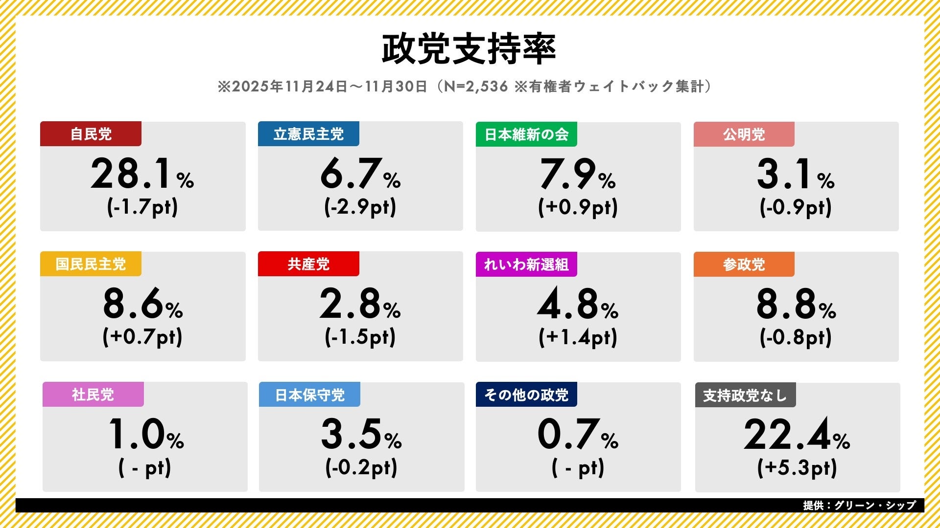 ジャッグジャパン株式会社(本社:東京都渋谷区)は、株式会社グリーン・シップ(本社:東京都千代田区)と業務提携し、グリーン・シップが提供する日次世論調査「世論レーダー」のデータを提供しております。本日、2025年11月第4週(11月24日〜30日)の内閣支持率・政党支持率調査の結果を発表いたします。また、詳細レポートPDFを「世論レーダー」公式サイトの週次ページで販売開始しました。