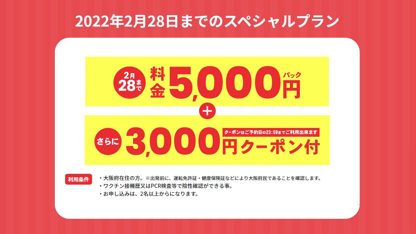 ・大阪府在住の方。※出発前に、運転免許証・健康保険証などにより大阪府民であることを確認します。