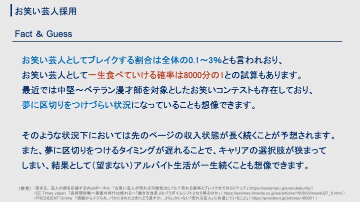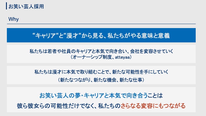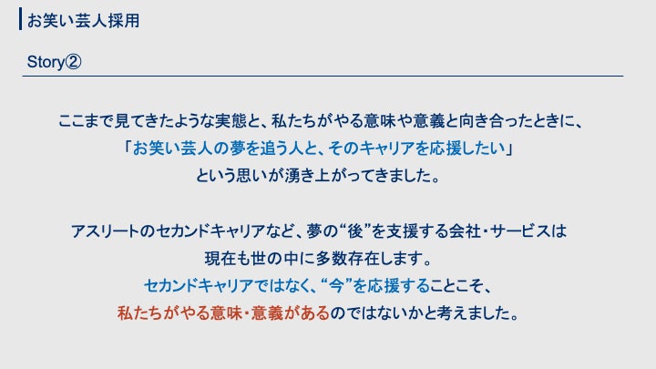 このような現状を顧みたとき、お笑い芸人をエンジニアとして採用することを通じて、「お笑い芸人の夢を追う人と、そのキャリアを応援したい」という思いが湧き上がってきました。