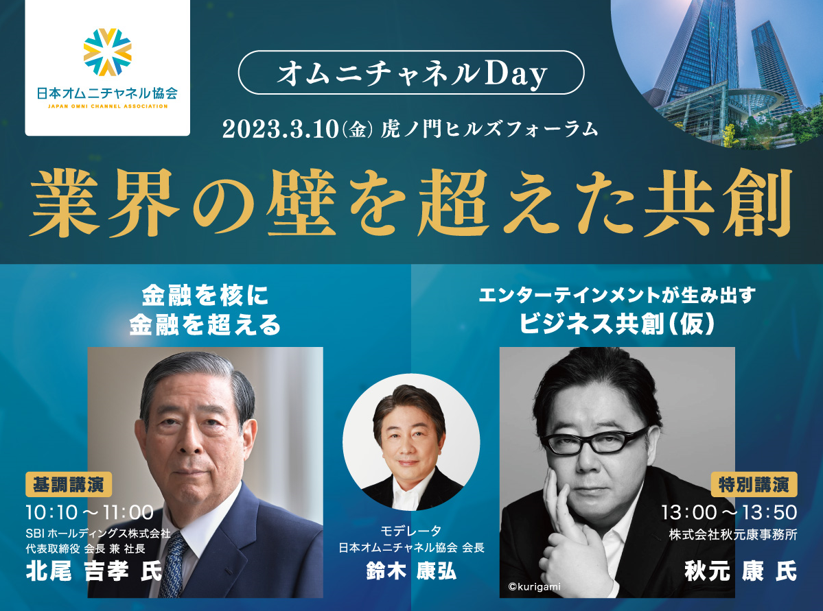 本カンファレンス「オムニチャネルDay」は、すべての業界・企業・組織の壁を超え、すべての人々がつながり共創することを目的として開催いたします。基調講演に、北尾 吉孝氏(SBIホールディングス株式会社 代表取締役 会長 兼 社長)、特別講演に、秋元 康氏(株式会社秋元康事務所 作詞家)を始めとした各界のリーダーをお招きし、今までの常識の枠を超えた発想を学ぶ機会、参加者間の交流の場を提供してまいります。