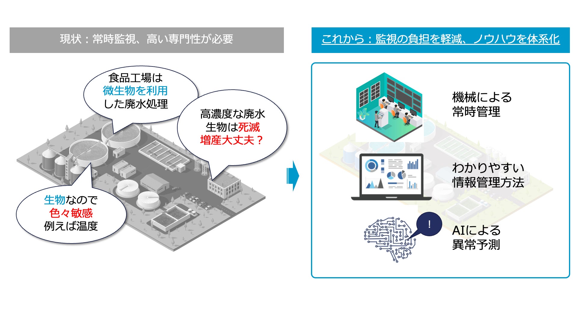 食品工場では大量の水を消費します。そして、適切に処理を行い無害化することが重要です。また、一度事故が起こると魚が死んだり、利水が停止したりと、場合によっては大きな影響が出ることがあります。このため、工場から河川への放流は水質に悪影響が及ばないように法律で厳しく基準値が定められています。高い専門性が求められることや、常時監視の必要性、季節などによる稼働条件が変わることなど、リスクを想定した運用体制構築が重要となります。
