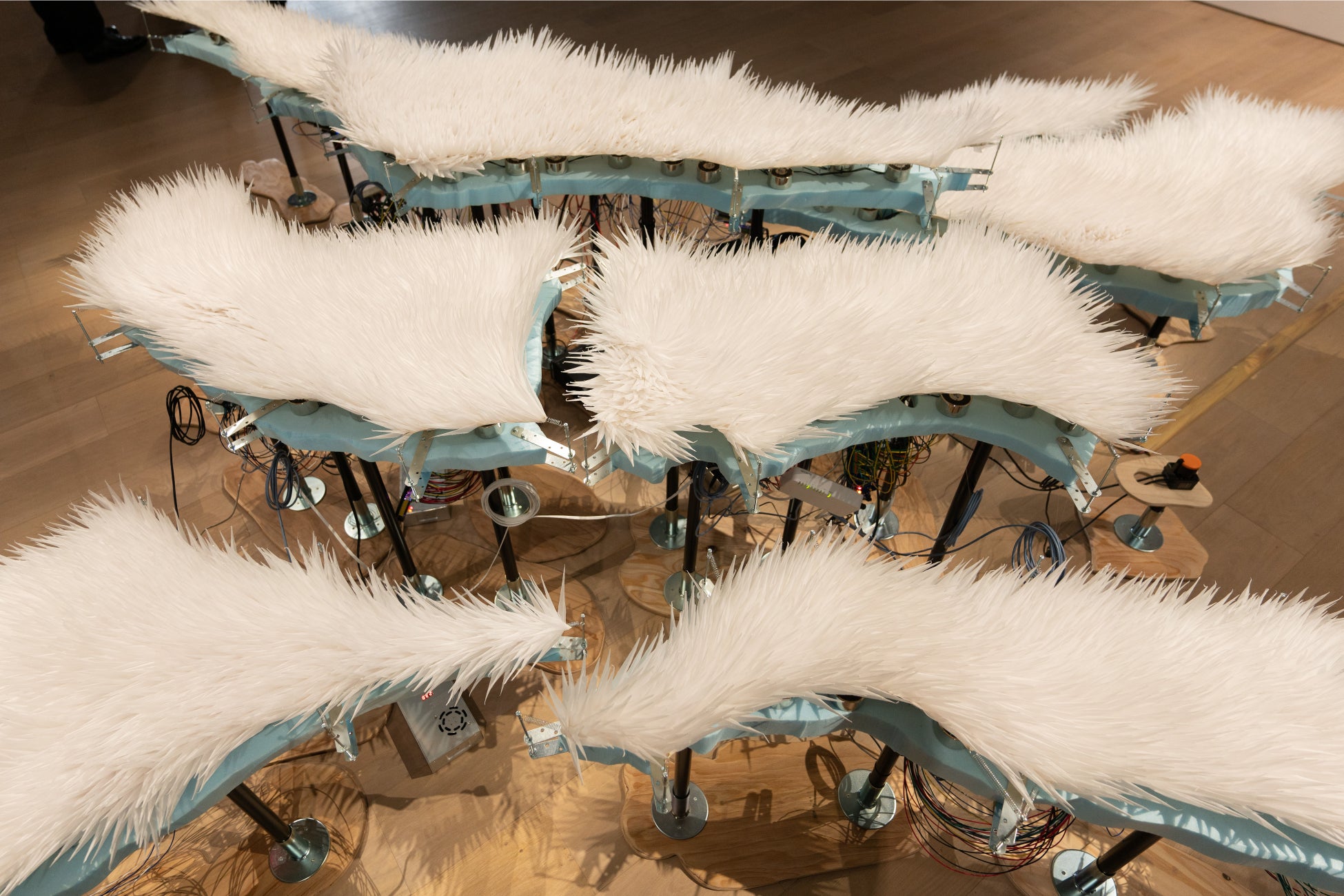 光を用いたセンシング技術であるLiDAR(ライダー)によって、鑑賞者の位置や動きを捉え、電磁石224個が作り出す磁力のフィールドと紙で作られた羽根のような表面が呼応して動く。