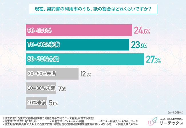 「紙契約書の利用率は全体のどれくらいですか?」と質問したところ、『50~70%未満(27.3%)』と回答した方が最も多く、次いで『90~100%(24.6%)』『70~90%未満(23.9%)』と続きました。