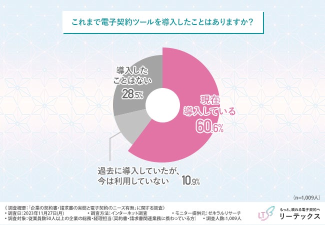 今回の調査で、従業員数50人以上の企業の約6割が電子契約ツールを現在導入している結果が明らかになりました。