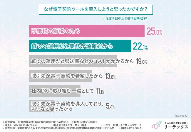 続いて、「なぜ電子契約ツールを導入しようと思ったのですか?」と質問したところ、『印紙税の節税のため(25.0%)』と回答した方が最も多く、次いで『紙での運用だと業務が煩雑だから(22.1%)』『紙での運用だと郵送費などのコストがかかるから(19.0%)』と続きました。