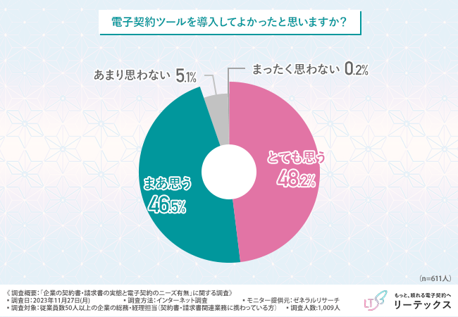 最後に、「電子契約ツールを導入してよかったと思いますか?」と質問したところ、『とても思う(48.2%)』と回答した方が最も多く、次いで『まあ思う(46.5%)』と続きました。