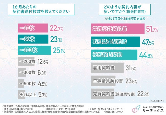 「1か月あたりの契約書送付枚数を教えてください」と質問したところ、『~100枚(25.1%)』と回答した方が最も多く、次いで『~50枚(23.1%)』『~10枚(22.7%)』と続きました。