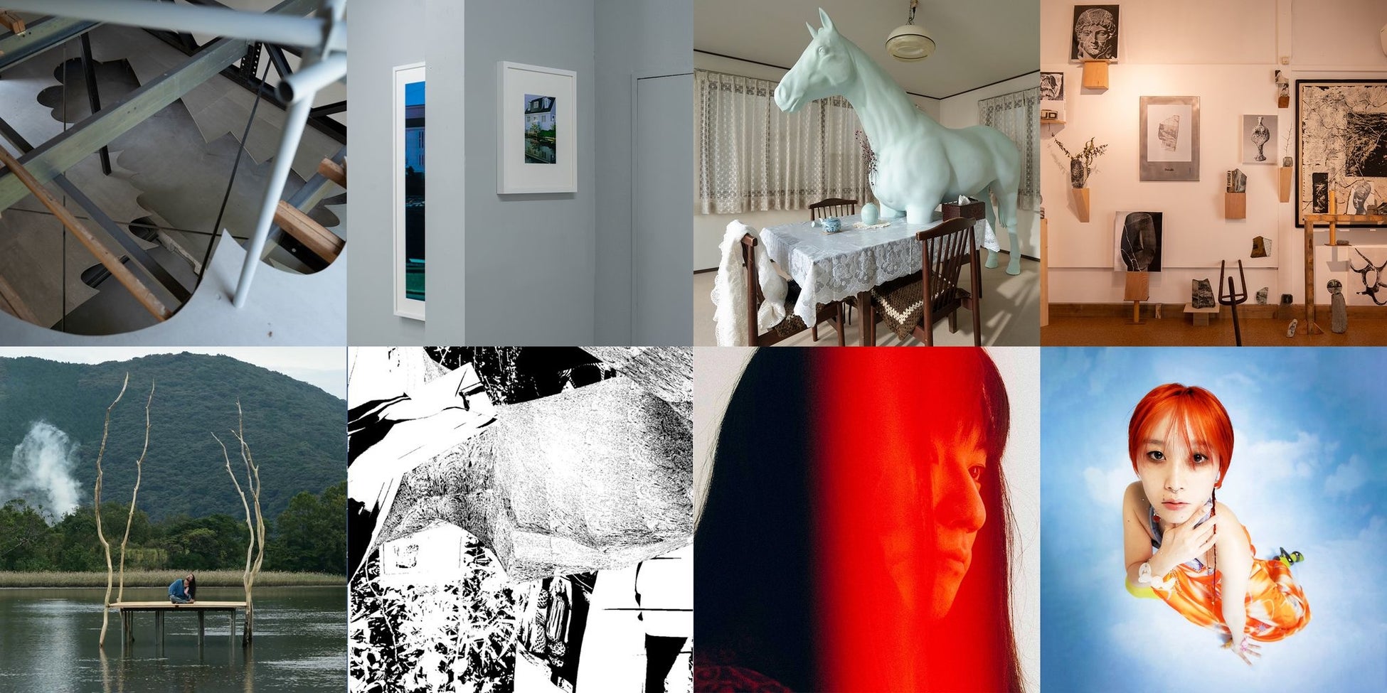 左上から右回りに、GROUP《海老名芸術高速》|竹久直樹《スーサイドシート》展示風景、2022年|冨安由真《The Doom》2021年、個展「The Doom」2021-22年、アートフロントギャラリー(展示風景より)、撮影:西野正将、Courtesy: Art Front Gallery|細野晃太朗《naked point》Artist:Ryohei Sasaki|NTsKi|マヒトゥ・ザ・ピーポー|∈Y∋|森山泰地《水神 [suijin]》2016年