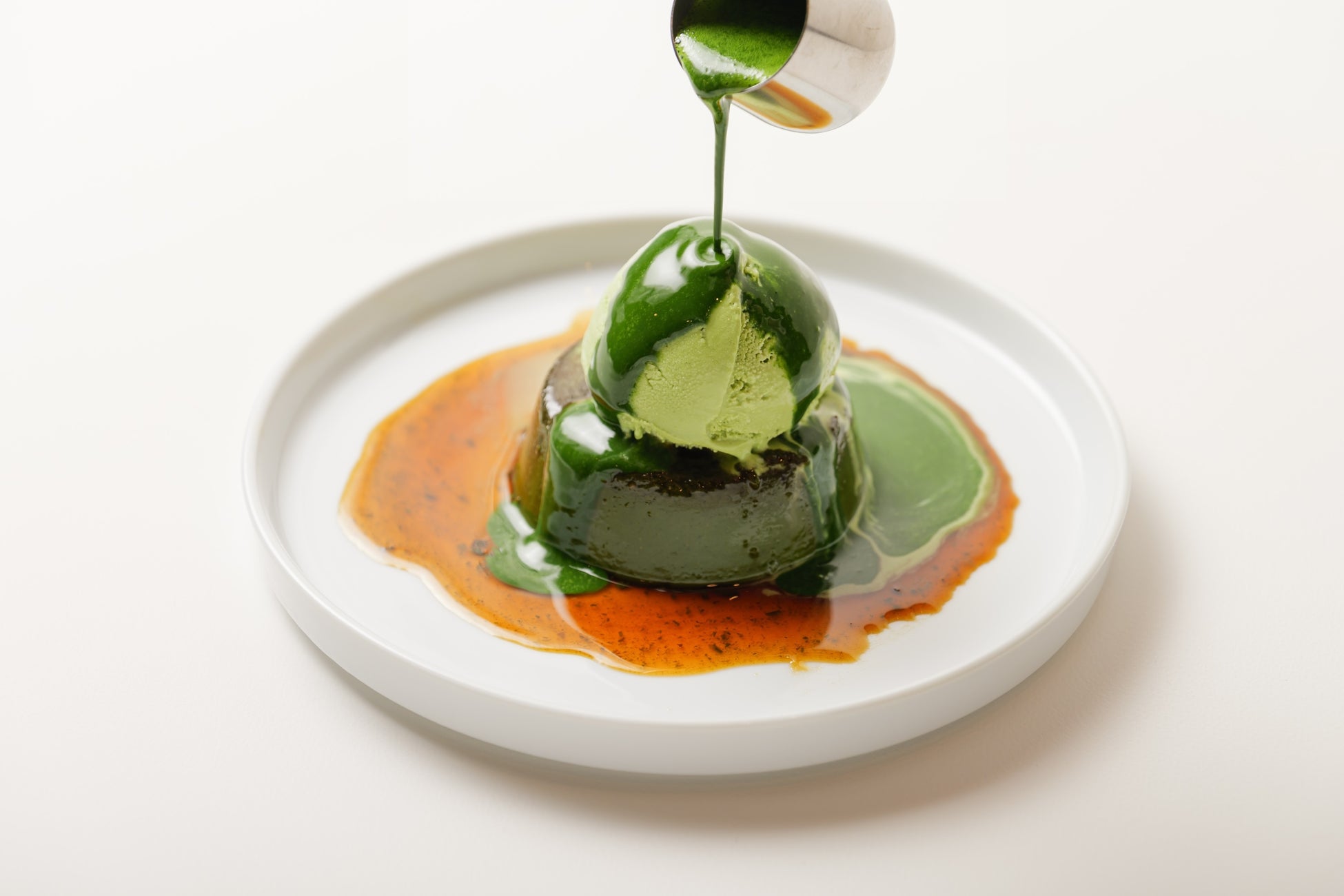 土台となる抹茶プリンは、昭和の時代に提供されていた固めなプリンに、お点前で使う高品質な抹茶をたっぷり練りこんで作りました。ねっとりとしたプリンの食感と、濃厚な抹茶の旨味を楽しめます。