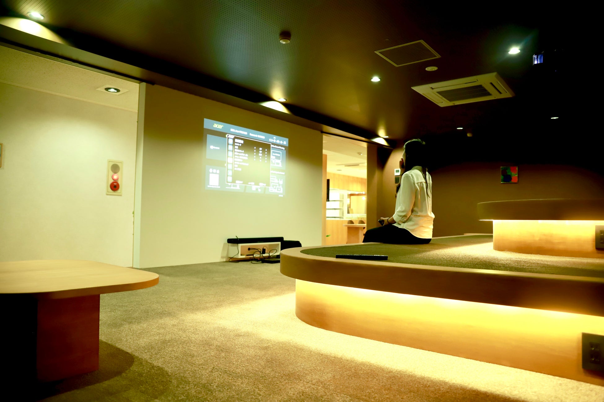 リビング兼シアタースペースでは、食事をしたりくつろぐだけでなく、大画面で映画やスポーツ観戦などを楽しめる空間になっています。