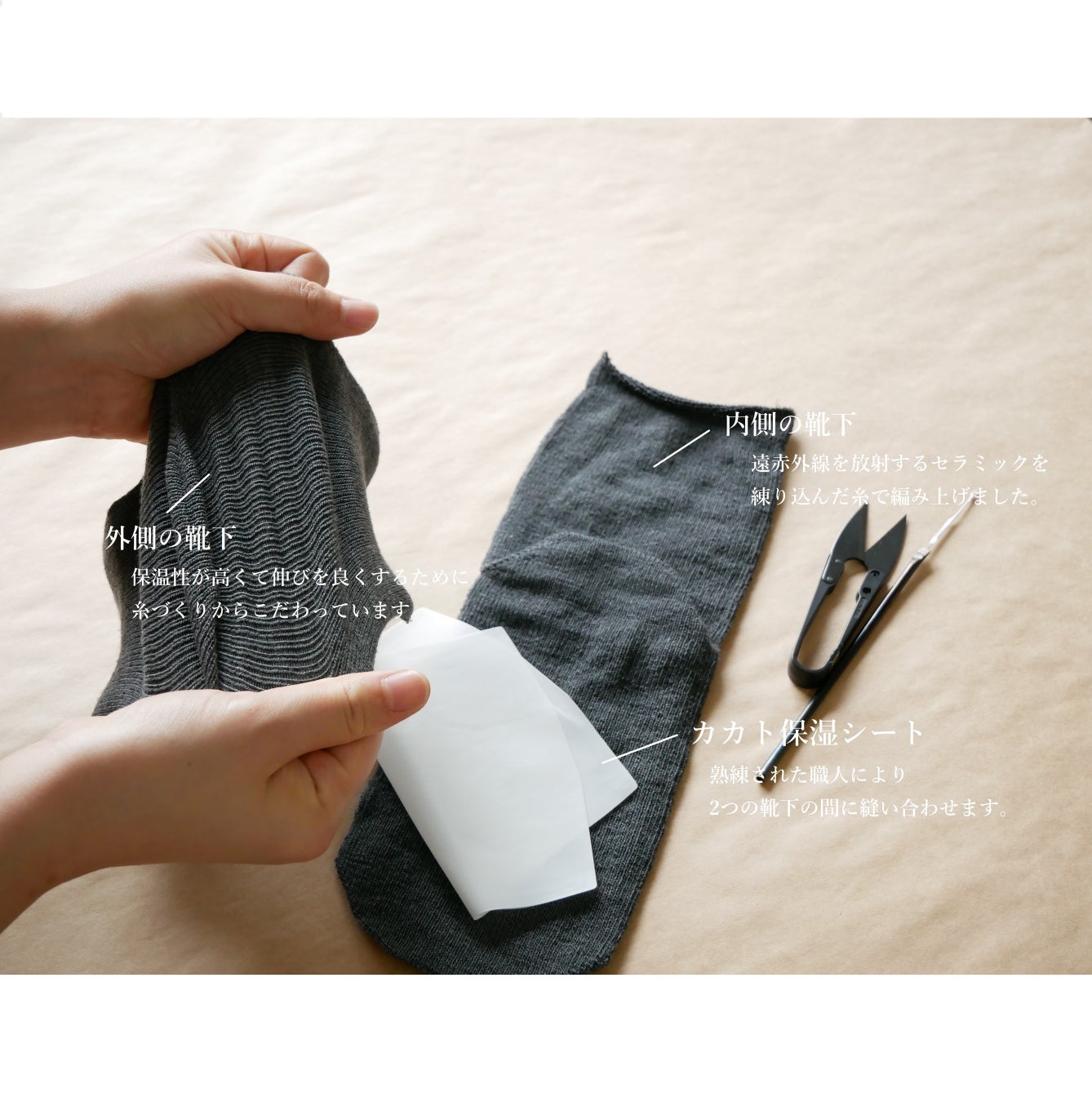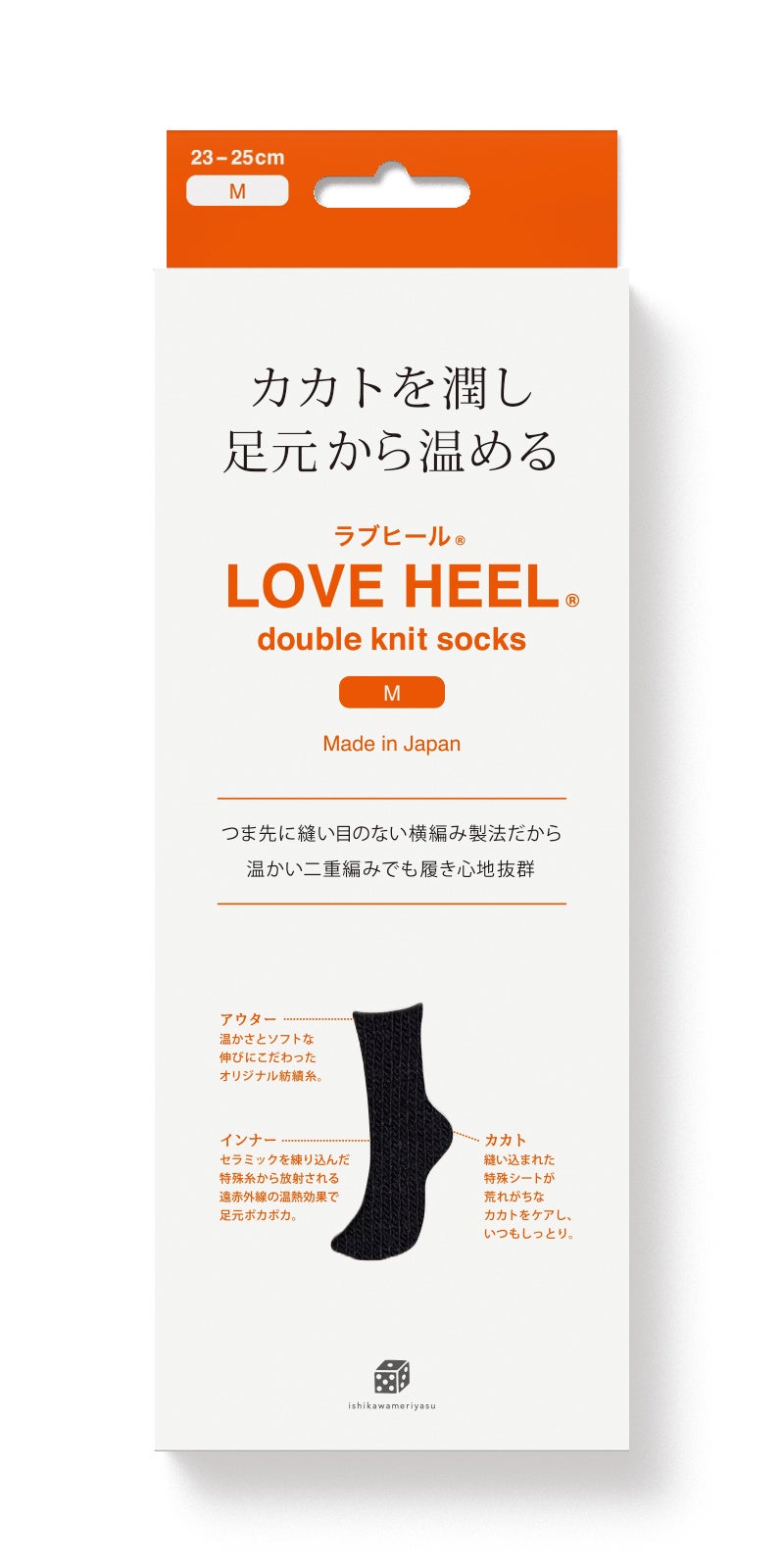 愛され続けて30年以上のロングヒット商品の靴下です。二重編みなので温かさを逃がさず、保湿力・耐久力に優れています。カカト部分に特殊シートを縫い付けるという独自の加工方法により、履くだけでカカトのお手入れも出来ます。つま先に縫い目が無いので、ストレス無く履き続けられます。お好みに合わせて自由に選べる豊富なカラーバリエーション。包装は高級感のある1足箱に入りで、冷え性に悩む方へのプレゼントにもおすすめの商品です。