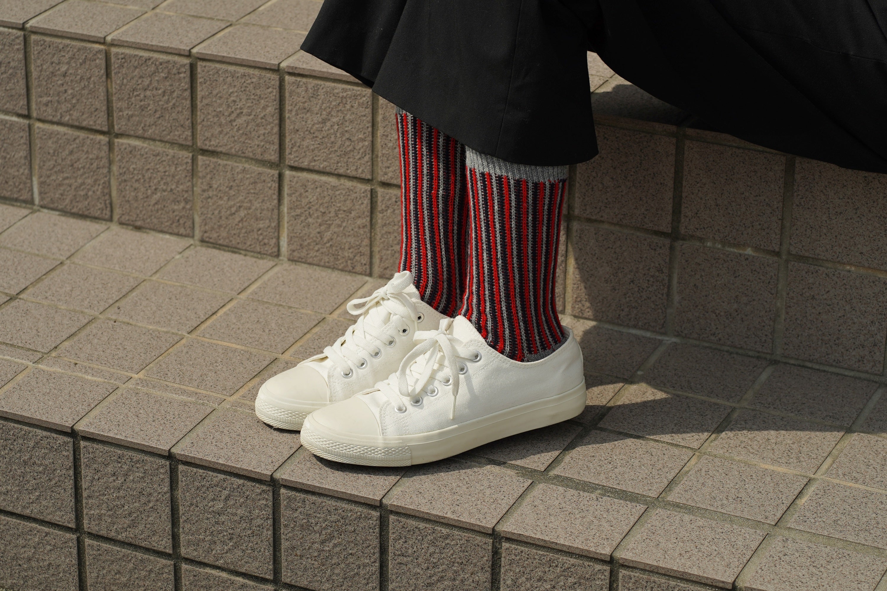 プリントではなく編地模様でストライプを表現した靴下。国内・海外で所有している工場は珍しいジャガード編み機だからなせる、カラフルな編地でファッションを楽しんでください。上質なラムウールを使用しているので履き心地もやわらく真冬でも暖か。丈夫で破れにくいので長くご愛用いただけます。アウトドアにもぴったりです。