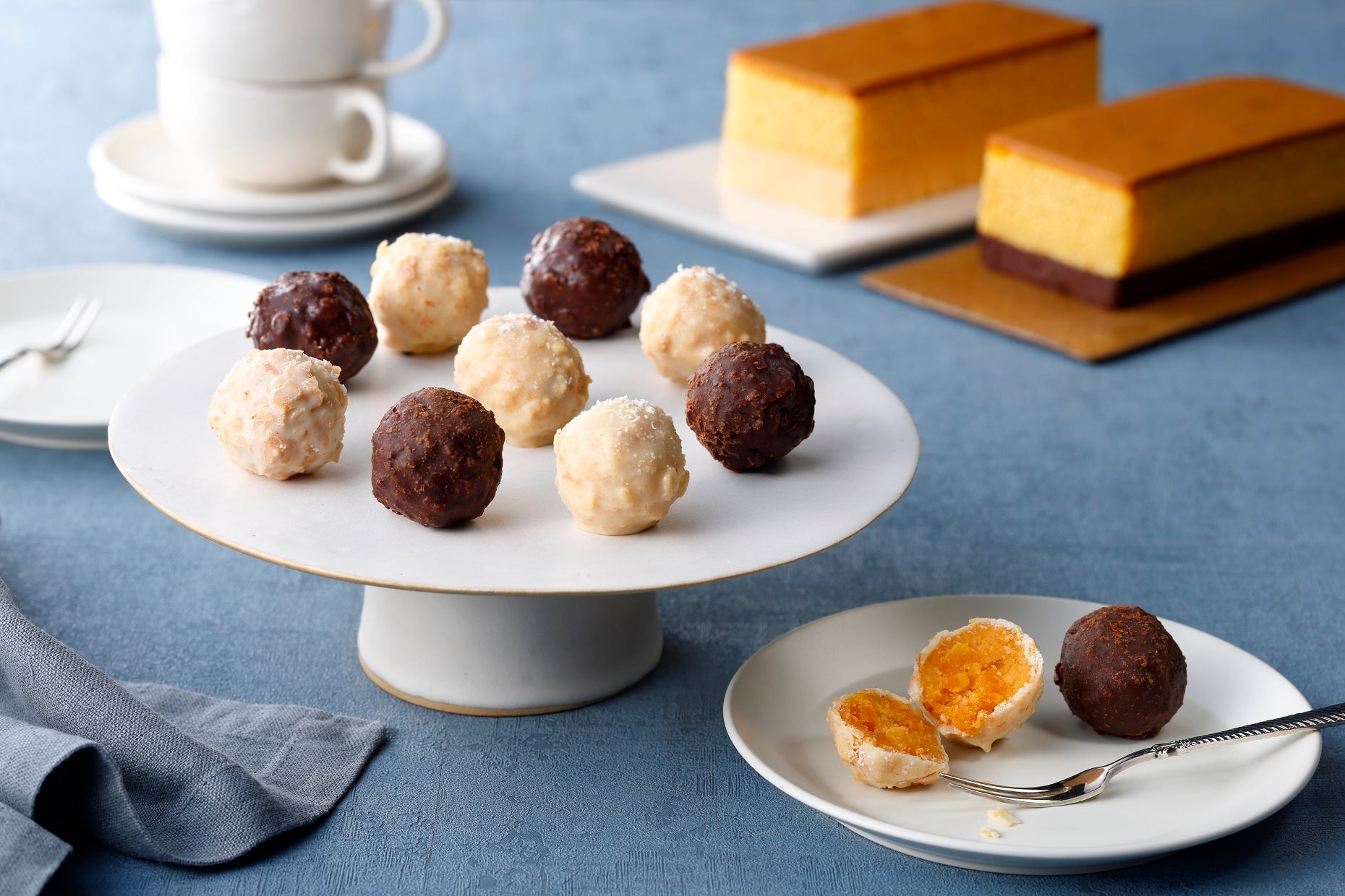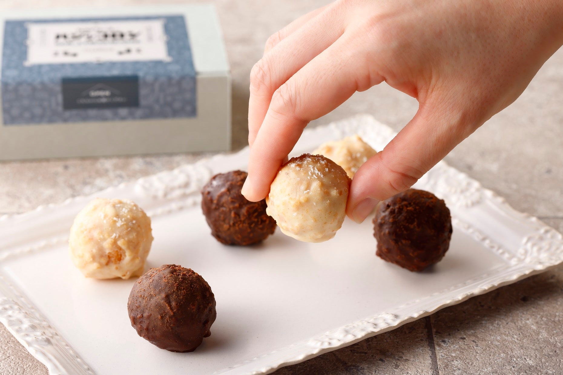 『ハジッコロン』は、長崎の『BLUEPRINT PATISSERIE LOUNGE-ブループリント パティスリーラウンジ-』で、パティシエがひとつひとつ丁寧に手作り。『長崎カステリーヌ』のテリーヌとカステラ生地をコロンっと小さなケーキに成形し、プレーンにはあんず、ショコラにはいちじくの香り豊かなドライフルーツを閉じ込めて味のアクセントにしています。コク深いチョコレートでコーティングし、果実とショコラの風味豊かな2種のひと口ケーキに。パティシエの手作業による繊細な味わいをお楽しみいただけます。